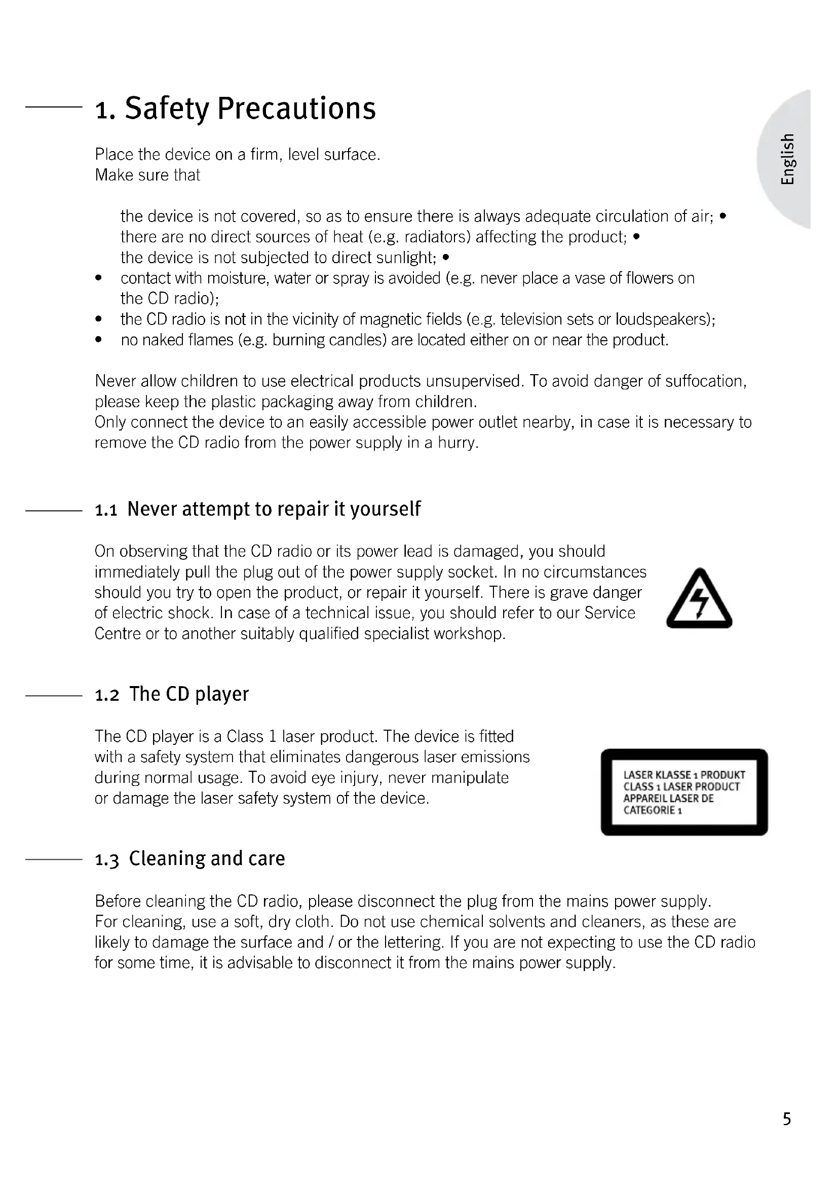 Before cleaning the CD radio, please disconnect the plug from the mains power supply. For cleaning, use a soft, dry cloth. Do not use chemical solvents and cleaners, as these are likely to damage the surface and / or the lettering. If you are not expecting to use the CD radio for some time, it is advisable to disconnect it from the mains power supply.