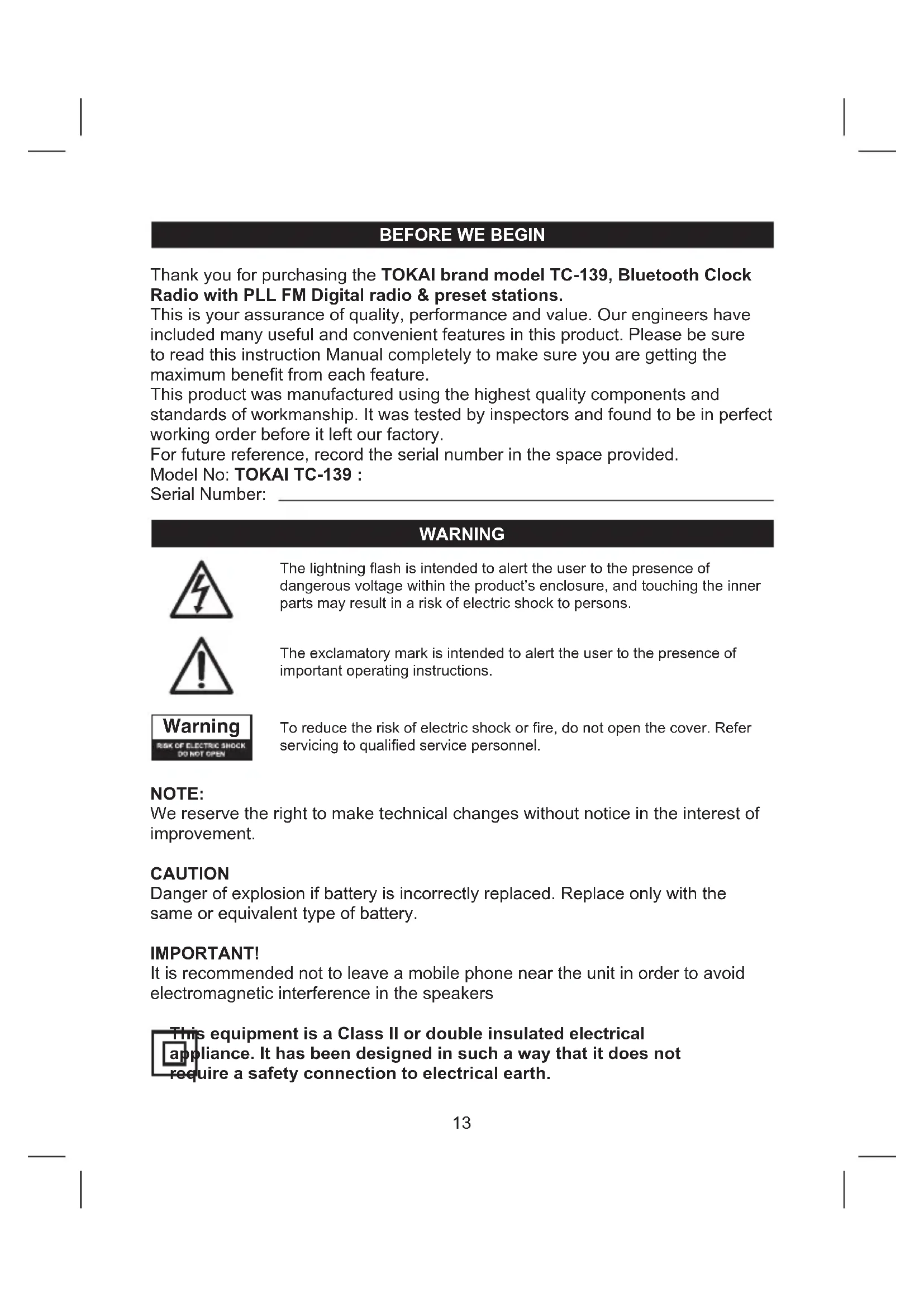 Thank you for purchasing the TOKAI brand model TC-139, Bluetooth Clock Radio with PLL FM Digital radio & preset stations. This is your assurance of quality, performance and value. Our engineers have included many useful and convenient features in this product. Please be sure to read this instruction Manual completely to make sure you are getting the maximum benet from each feature. This product was manufactured using the highest quality components and standards of workmanship. It was tested by inspectors and found to be in perfect working order before it left our factory. For future reference, record the serial number in the space provided. Model No: TOKAI TC-139 : Serial Number: WARNING NOTE: We reserve the right to make technical changes without notice in the interest of improvement. CAUTION Danger of explosion if battery is incorrectly replaced. Replace only with the same or equivalent type of battery. IMPORTANT! It is recommended not to leave a mobile phone near the unit in order to avoid electromagnetic interference in the speakers This equipment is a Class II or double insulated electrical appliance. It has been designed in such a way that it does not require a safety connection to electrical earth.