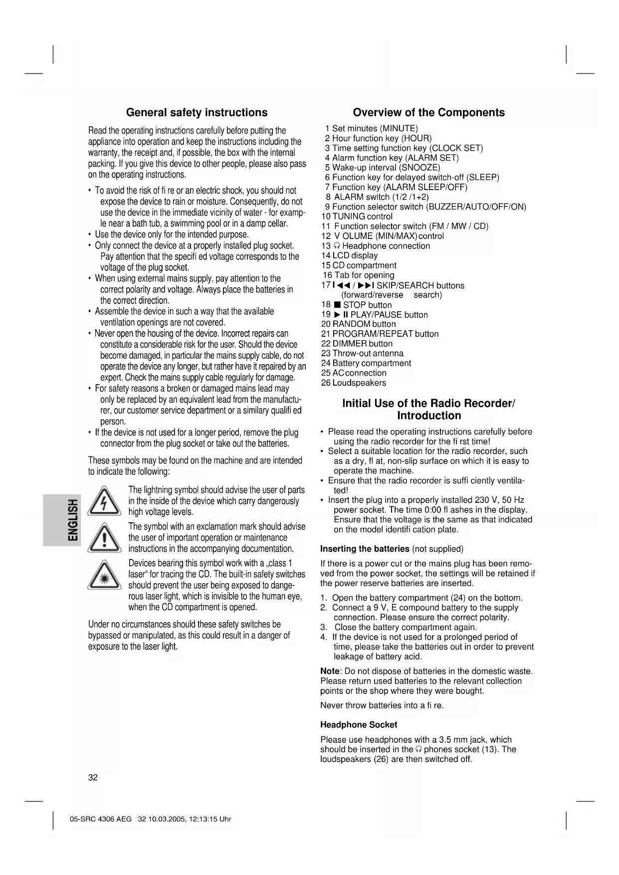time, please take the batteries out in order to prevent leakage of battery acid. Note: Do not dispose of batteries in the domestic waste. Please return used batteries to the relevant collection points or the shop where they were bought. Never throw batteries into a fi re. Headphone Socket Please use headphones with a 3.5 mm jack, which should be inserted in the phones socket (13). The loudspeakers (26) are then switched off. 05-SRC 4306 AEG 32 10.03.2005, 12:13:15 Uhr Read the operating instructions carefully before putting the appliance into operation and keep the instructions including the warranty, the receipt and, if possible, the box with the internal packing. If you give this device to other people, please also pass on the operating instructions.