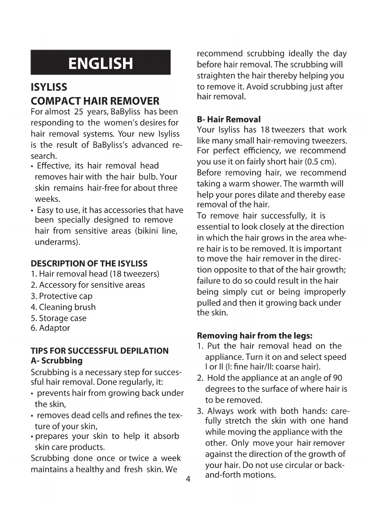 - prepares your skin to help it absorb skin care products. Scrubbing done once or twice a week maintains a healthy and fresh skin. We recommend scrubbing ideally the day before hair removal. The scrubbing will straighten the hair thereby helping you to remove it. Avoid scrubbing just after hair removal. B- Hair Removal Your Isyliss has 18 tweezers that work like many small hair-removing tweezers. For perfect eciency, we recommend you use it on fairly short hair (0.5 cm). Before removing hair, we recommend taking a warm shower. The warmth will help your pores dilate and thereby ease removal of the hair. To remove hair successfully, it is essential to look closely at the direction in which the hair grows in the area whe- re hair is to be removed. It is important to move the hair remover in the direc- tion opposite to that of the hair growth; failure to do so could result in the hair being simply cut or being improperly pulled and then it growing back under the skin. Removing hair from the legs:
