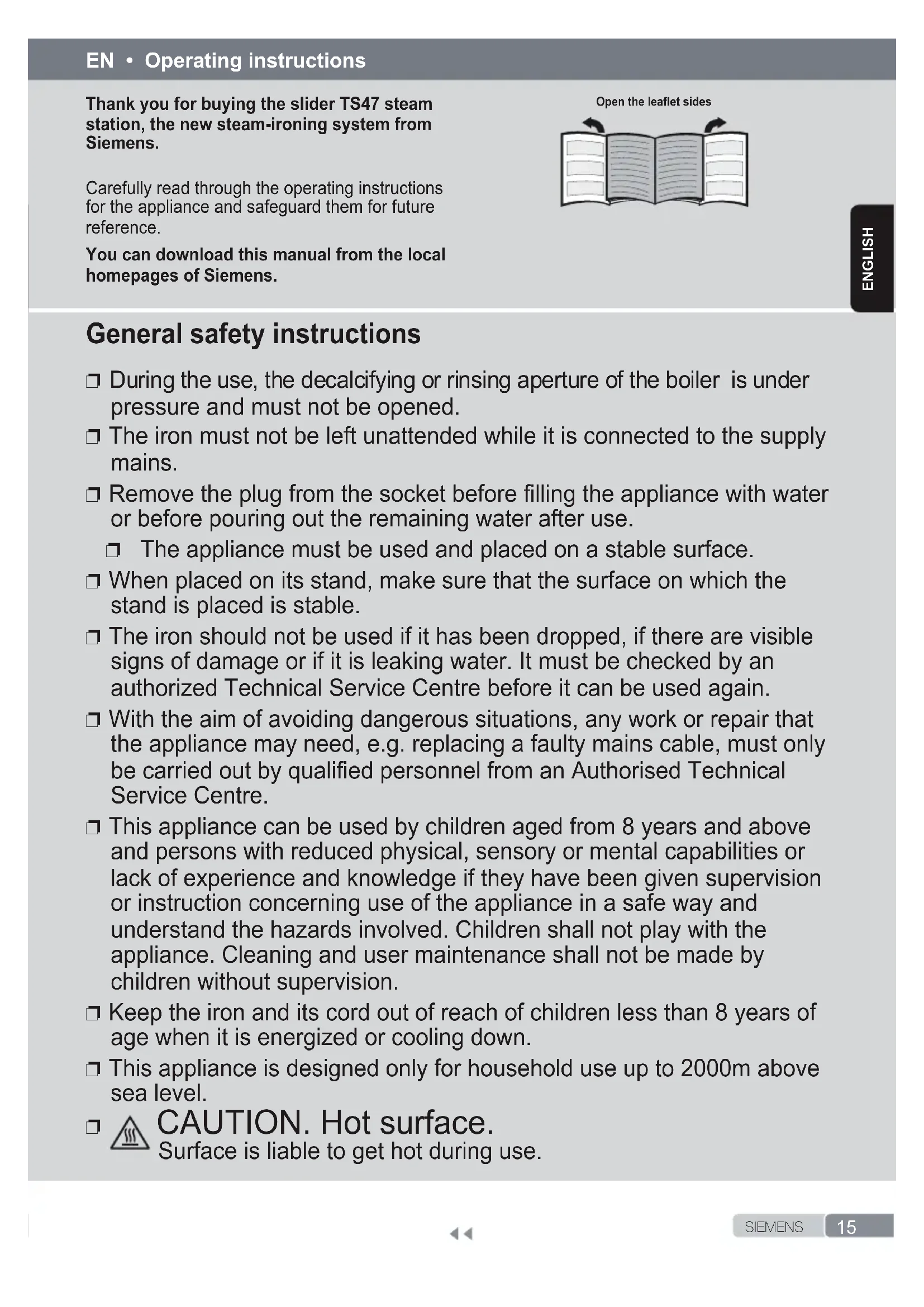 und das Bügeleisen hört sofort auf zu dampfen. Wenn das Problem mit den obigen Schritten nicht gelöst werden kann, wenden Sie sich bitte an einen autorisierten technischen Kundendienst.15 S I E M E N SenglIsH Thank you for buying the slider TS47 steam station, the new steam-ironing system from Siemens. Carefully read through the operating instructions for the appliance and safeguard them for future reference. You can download this manual from the local homepages of Siemens. Open the leaet sides EN • Operating instructions General safety instructions ❐ During the use, the decalcifying or rinsing aperture of the boiler is under pressure and must not be opened. ❐ The iron must not be left unattended while it is connected to the supply mains. ❐ Remove the plug from the socket before lling the appliance with water or before pouring out the remaining water after use. ❐ The appliance must be used and placed on a stable surface. ❐ When placed on its stand, make sure that the surface on which the stand is placed is stable. ❐ The iron should not be used if it has been dropped, if there are visible signs of damage or if it is leaking water. It must be checked by an authorized Technical Service Centre before it can be used again. ❐ With the aim of avoiding dangerous situations, any work or repair that the appliance may need, e.g. replacing a faulty mains cable, must only be carried out by qualied personnel from an Authorised Technical Service Centre. ❐ This appliance can be used by children aged from 8 years and above and persons with reduced physical, sensory or mental capabilities or lack of experience and knowledge if they have been given supervision or instruction concerning use of the appliance in a safe way and understand the hazards involved. Children shall not play with the appliance. Cleaning and user maintenance shall not be made by children without supervision. ❐ Keep the iron and its cord out of reach of children less than 8 years of age when it is energized or cooling down. ❐ This appliance is designed only for household use up to 2000m above sea level. ❐ CAUTION. Hot surface. Surface is liable to get hot during use.16 S I E M E N S