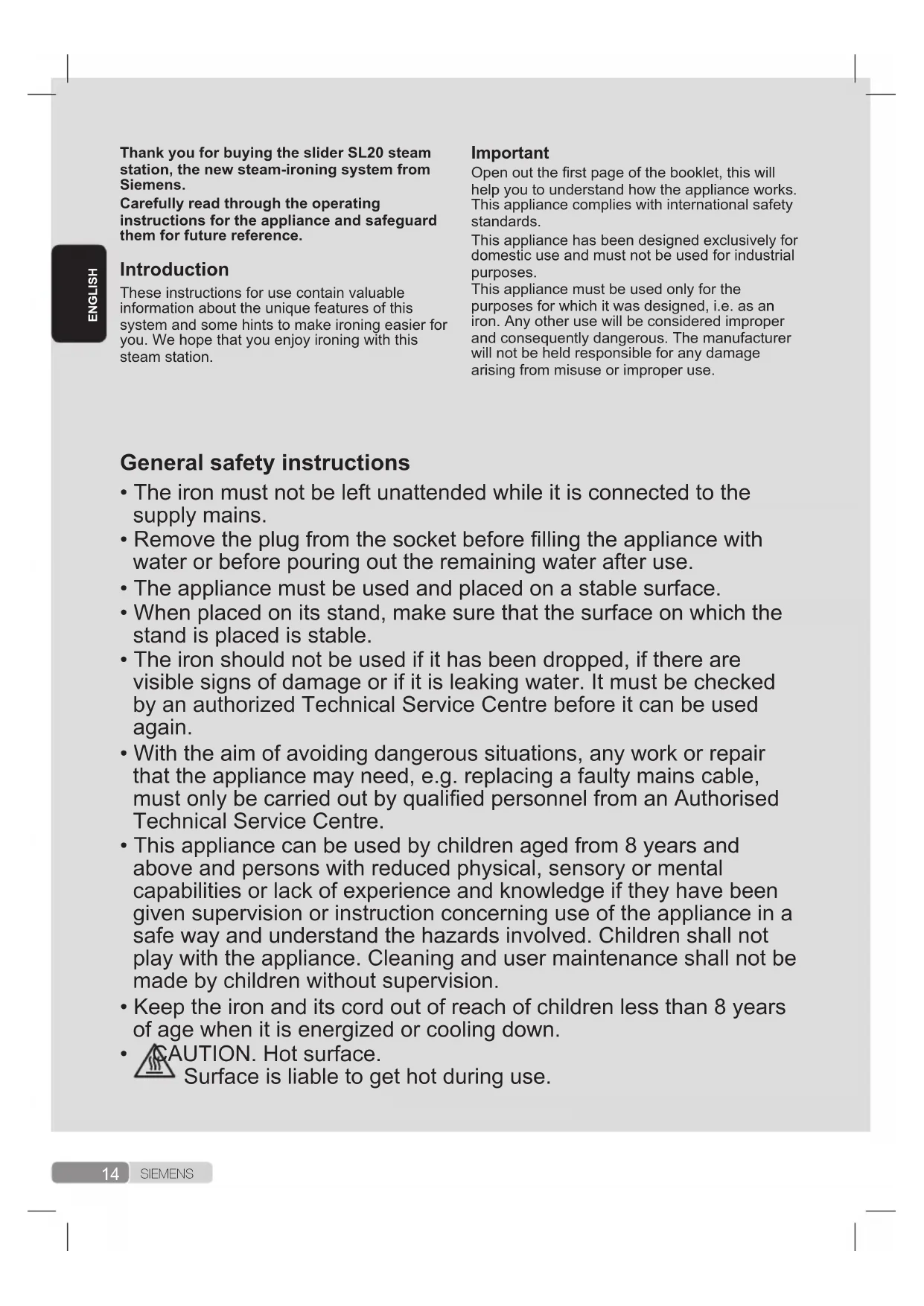- Bitte pressen Sie die Dampftaste erneut und das Bügeleisen wird umgehend aufhören zu Dampfen. Wenn die Angaben in der vorangehenden Tabelle das Problem nicht lösen, setzen Sie sich bitte mit einem zugelassenen technischen Kundendienst in Verbindung.14 S I E M E N SENGLISH ThankyouforbuyingthesliderSL20steam station,thenewsteam-ironingsystemfrom Siemens. Carefullyreadthroughtheoperating instructionsfortheapplianceandsafeguard themforfuturereference. Introduction These instructions for use contain valuable information about the unique features of this system and some hints to make ironing easier for you. We hope that you enjoy ironing with this steam station. Important Open out the rst page of the booklet, this will help you to understand how the appliance works. This appliance complies with international safety standards. This appliance has been designed exclusively for domestic use and must not be used for industrial purposes. This appliance must be used only for the purposes for which it was designed, i.e. as an iron. Any other use will be considered improper and consequently dangerous. The manufacturer will not be held responsible for any damage arising from misuse or improper use. Generalsafetyinstructions