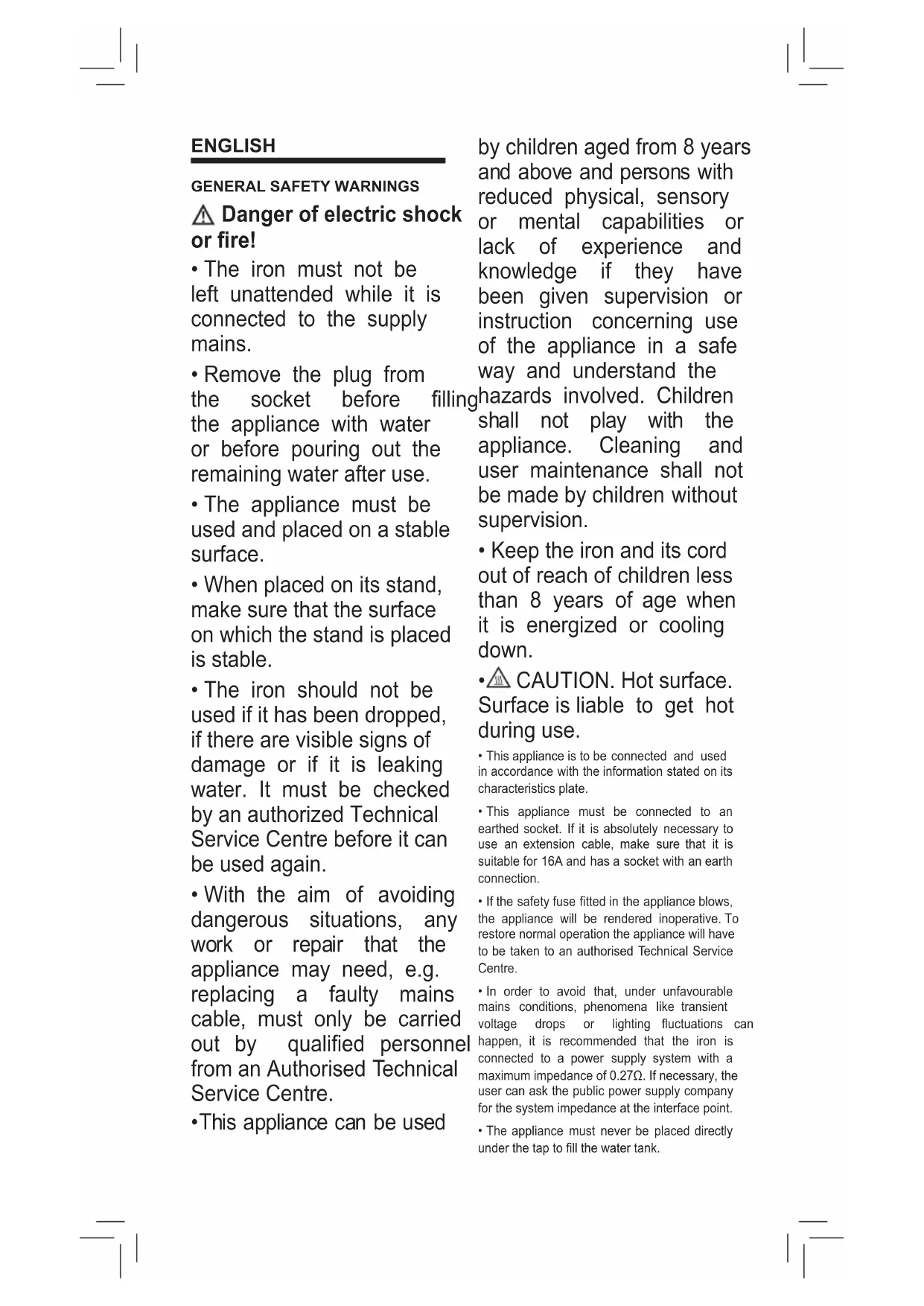 - The iron should not be used if it has been dropped, if there are visible signs of damage or if it is leaking water. It must be checked by an authorized Technical Service Centre before it can be used again.