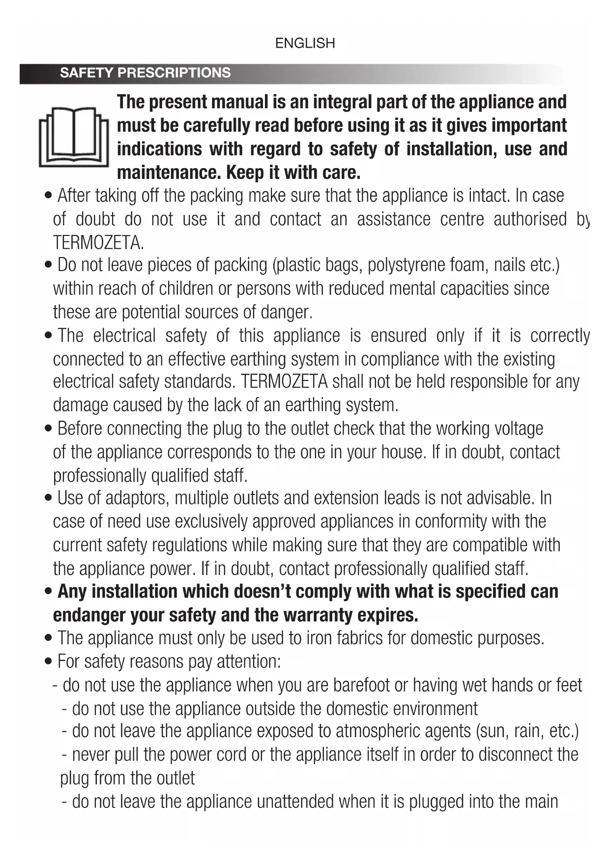 - The electrical safety of this appliance is ensured only if it is correctly connected to an effective earthing system in compliance with the existing electrical safety standards. TERMOZETA shall not be held responsible for any damage caused by the lack of an earthing system.