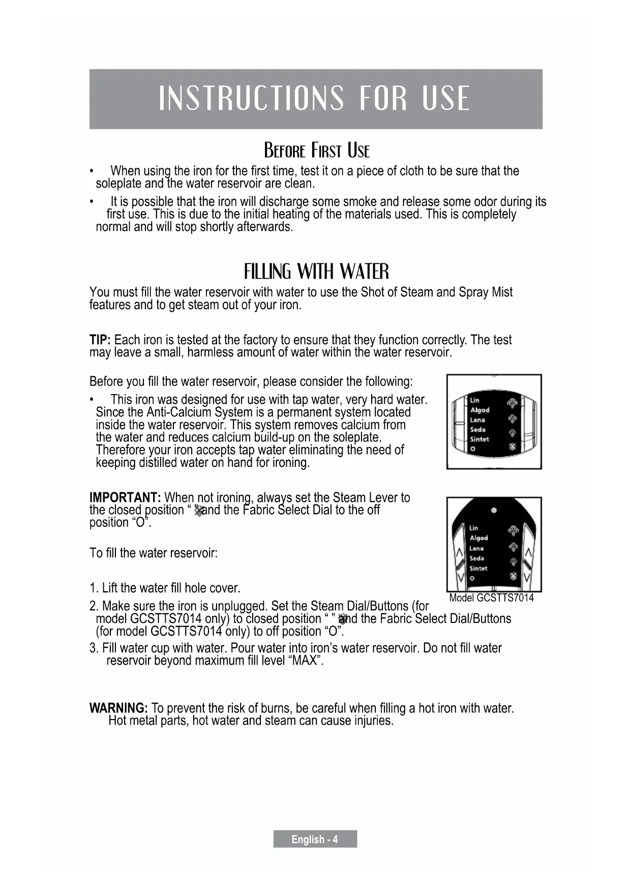 model GCSTTS7014 only) to closed position “ ” and the Fabric Select Dial/Buttons (for model GCSTTS7014 only) to off position “O”. 3.Fillwatercupwithwater.Pourwaterintoiron’swaterreservoir.Donotllwater reservoirbeyondmaximumlllevel“MAX”.