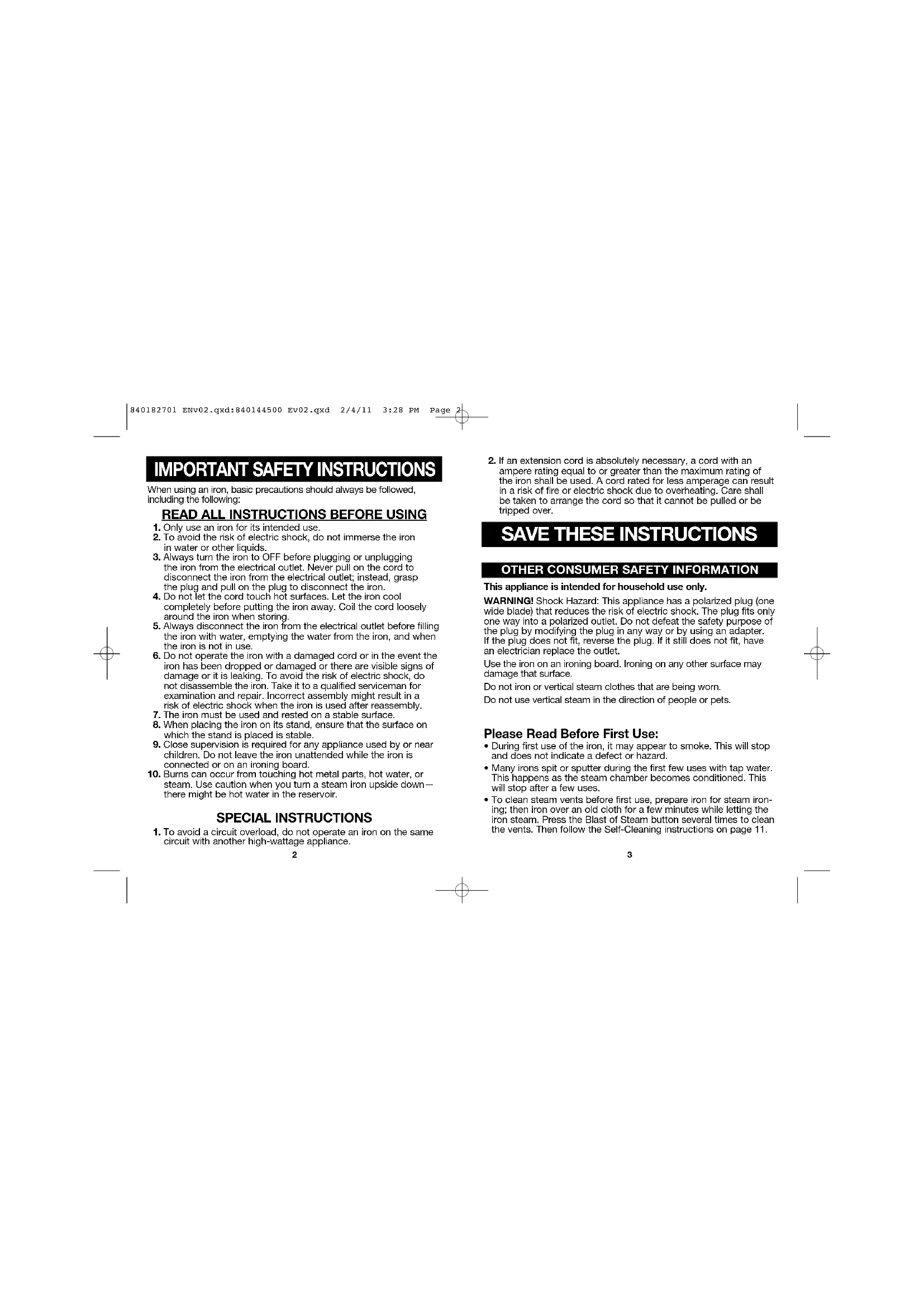 840182701 ENv02.qxd:840144500 Ev02.qxd 2/4/11 3:28 PM Page 13 When using an iron, basic precautions should always be followed, including the following: