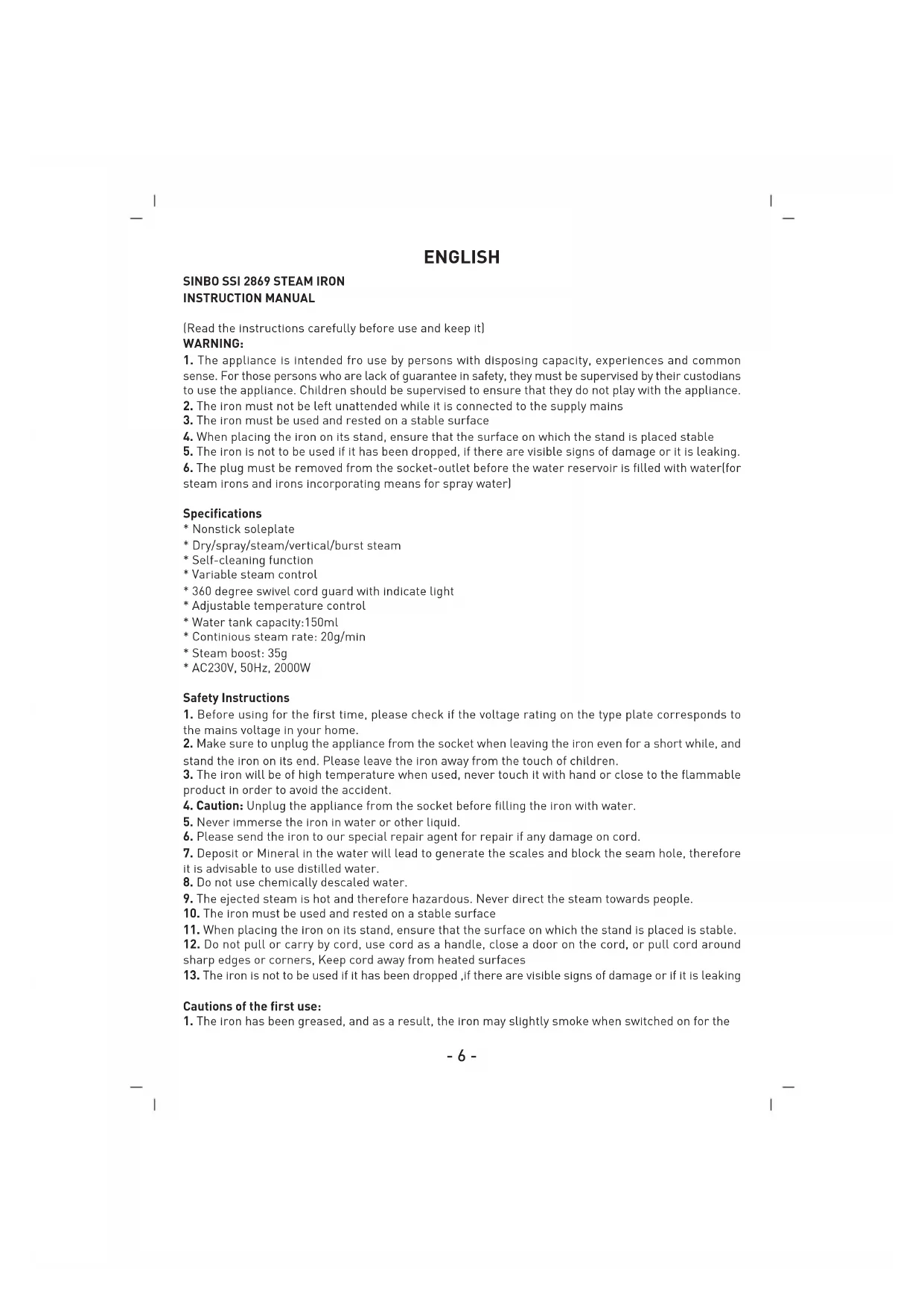 SSI 2869 - Iron SINBO - Free user manual and instructions