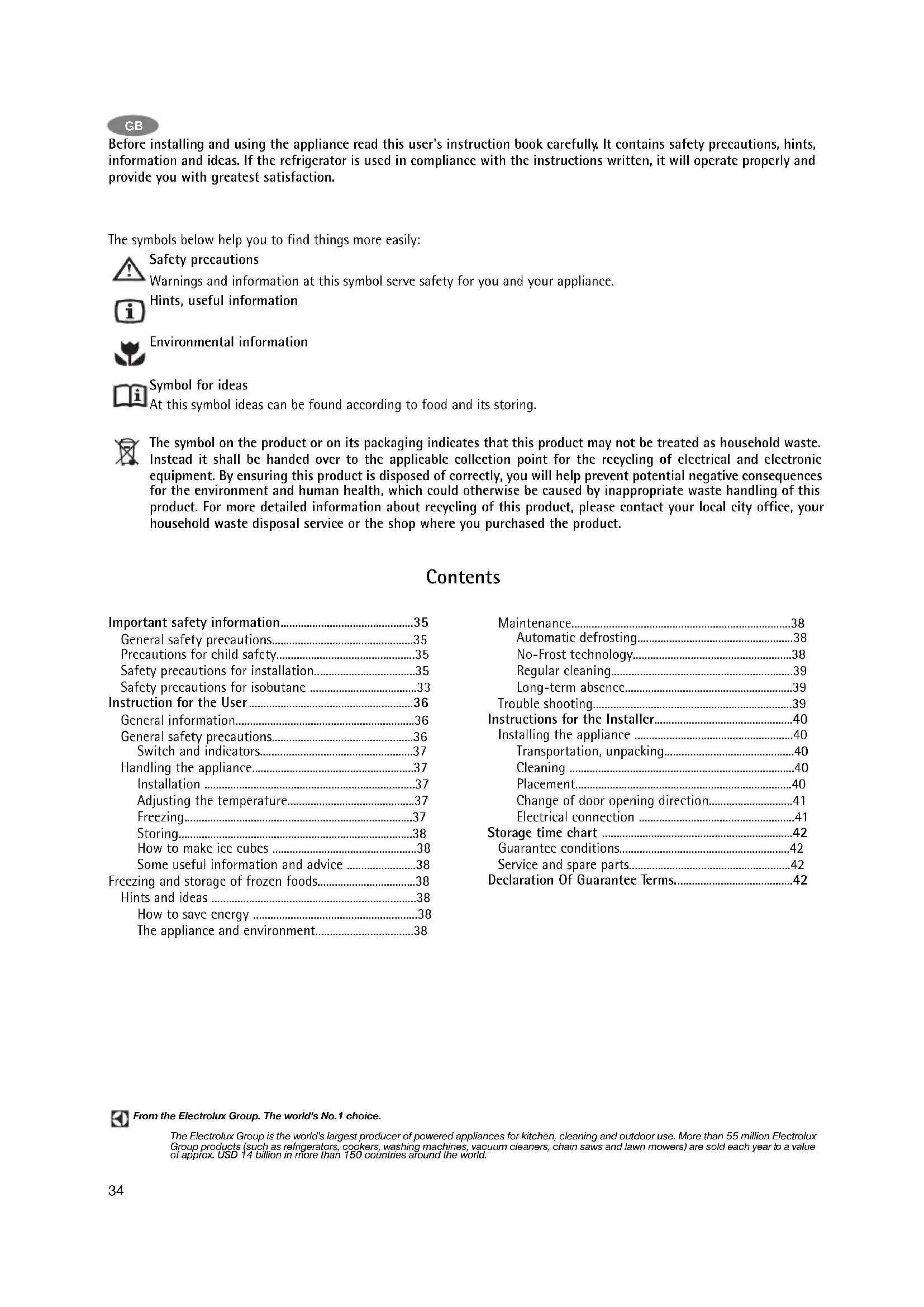 - Before installing and using the appliance read this user's instruction book carefully. It contains safety precautions, hints, information and ideas. If the refrigerator is used in compliance with the instructions written, it will operate properly and provide you with greatest satisfaction. The symbols below help you to find things more easily: Safety precautions Warnings and information at this symbol serve safety for you and your appliance. Hints, useful information Environmental information Symbol for ideas At this symbol ideas can be found according to food and its storing. The symbol on the product or on its packaging indicates that this product may not be treated as household waste. Instead it shall be handed over to the applicable collection point for the recycling of electrical and electronic equipment. By ensuring this product is disposed of correctly, you will help prevent potential negative consequences for the environment and human health, which could otherwise be caused by inappropriate waste handling of this product. For more detailed information about recycling of this product, please contact your local city office, your household waste disposal service or the shop where you purchased the product. From the Electrolux Group. The world’s No.1 choice. The Electrolux Group is the world's largest producer of powered appliances for kitchen, cleaning and outdoor use. More than 55 million Electrolux Group products (such as refrigerators, cookers, washing machines, vacuum cleaners, chain saws and lawn mowers) are sold each year to a value of approx. USD 14 billion in more than 150 countries around the world. Important safety information p. 35