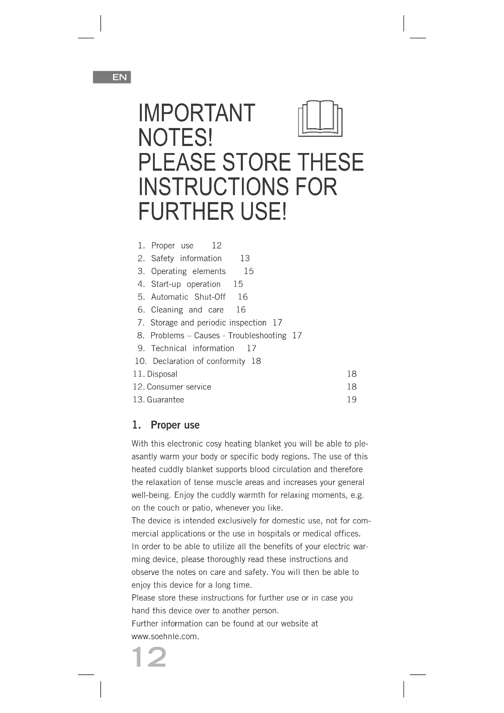 The device is intended exclusively for domestic use, not for commercial applications or the use in hospitals or medical offices. In order to be able to utilize all the benefits of your electric warming device, please thoroughly read these instructions and observe the notes on care and safety. You will then be able to enjoy this device for a long time.