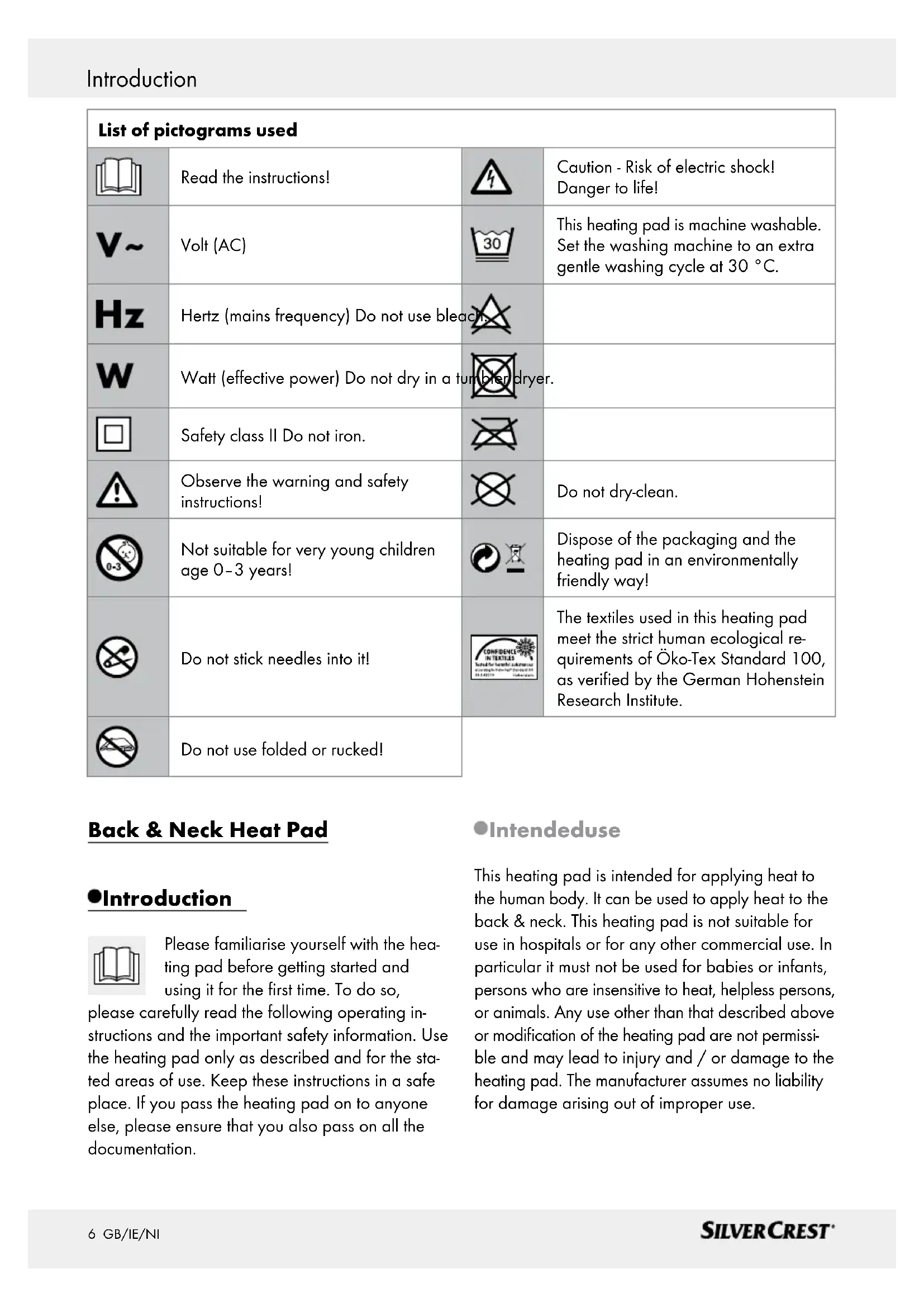 Plug-in connector (see fig. B) Scope of delivery Please check immediately on unpacking that the delivery scope is complete and that the heating pad is in perfect condition. 1 Back & Neck Heat Pad 1 Control unit / Plug-in connector 1 Set of operating instructions Technical data Model: SRNH 100 E3 Type: P10N Power supply: 220–240 V / 50–60 Hz Power input: 100 W Dimensions: approx. 62 x 41 cm Protection class: II / Electric field strength: max. 5000 V / m Magnetic field strength: max. 80 A / m Magnetic flux density: max. 0.1 milli-Tesla Material: Top / bottom: 100 % polyester Manufacturer: MGG Elektro GmbH Steinstraße 27 40210 Düsseldorf, Germany Important safety instructions Failure to ob- serve the following instructions can cause personal injury or property damage (electric shock, burns, fire). The following safety instructions and hazard warnings are not only inten- ded to protect your own health and the health of others, but also to pre- vent damage to the heating pad. Please observe these safety instruc- tions and pass on this operating ma- nual together with the heating pad. SCALDING HAZARD! This heating pad may not be used by persons insensitive to heat and other persons in need of protection who do not respond to overheating (e.g. diabetics, persons with skin changes caused by illness or scarred skin areas in the application area, after using analgesics or alcohol). There is a risk of receiving skin burns. This heating pad may not be used for very young children (0–3 years), as they are unable IMPORTANT INSTRUCTIONS – KEEP FOR FUTURE REFERENCE!8 GB/IE/NI to react to overheating. There is a risk of receiving skin burns. This heating pad may not be used by young children (3–8 years) unless the control unit was set by a parent or a supervising person and the child was adequately in- structed on the safe use of the heating pad. There otherwise is a risk of burns. This heating pad may be used by older children age 8 and up, and persons with diminished physical, sensory or mental capacities or lacking experience and know- ledge when supervised and in- structed on the safe use of the heating pad and understand the associated risks. Children must be supervised to prevent them from playing with the heating pad. There is a risk of injury. Children must not perform clean or maintain the product without supervision. There is a risk of in- jury. This heating pad is not intended for hospital or commercial use. This poses a risk of injuries and / or damage to the heating pad. Do not insert needles or pointed objects into the heating pad. There is a risk of electric shock. Do not switch on the heating pad whilst folded or pu- shed together. The heating pad may otherwise be damaged. Do not use when wet! Otherwise there is a risk of electric shock. This heating pad may only be operated together with the con- trol unit specified on the label. The heating pad may otherwise be damaged. The electric and magnetic fields emitted by this heating pad could potentially interfere with the func- tionality of your pacemaker. Ho- wever, the levels are far below the permissible limits: electric field strength: max. 5000 V / m, mag ne- tic field strength: max. 80 A / m, magnetic flux density: max. 0.1 milli-Tesla. Therefore please con- sult your physician and the manu- facturer of your pacemaker before using this heating pad.