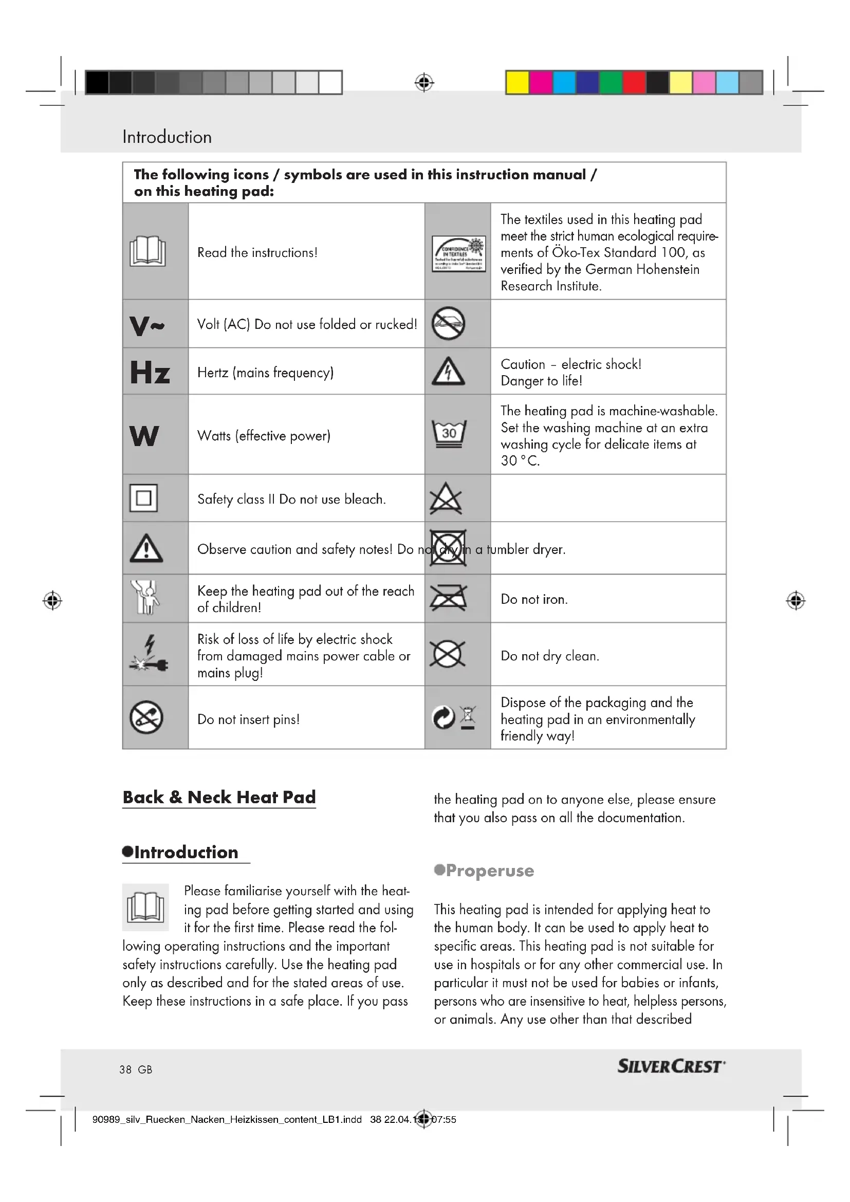Watts (effective power) The heating pad is machine-washable. Set the washing machine at an extra washing cycle for delicate items at 30 °C. Safety class II Do not use bleach. Observe caution and safety notes! Do not dry in a tumbler dryer. Keep the heating pad out of the reach of children! Do not iron. Risk of loss of life by electric shock from damaged mains power cable or mains plug! Do not dry clean. Do not insert pins! Dispose of the packaging and the heating pad in an environmentally friendly way! 90989_silv_Ruecken_Nacken_Heizkissen_content_LB1.indd 38 22.04.13 07:5539 GB Introduction / Important safety instructions above or modification of the heating pad are not permissible and may lead to injury and / or damage to the heating pad. The manufacturer accepts no liability for any damage caused by improper use. Description of parts
