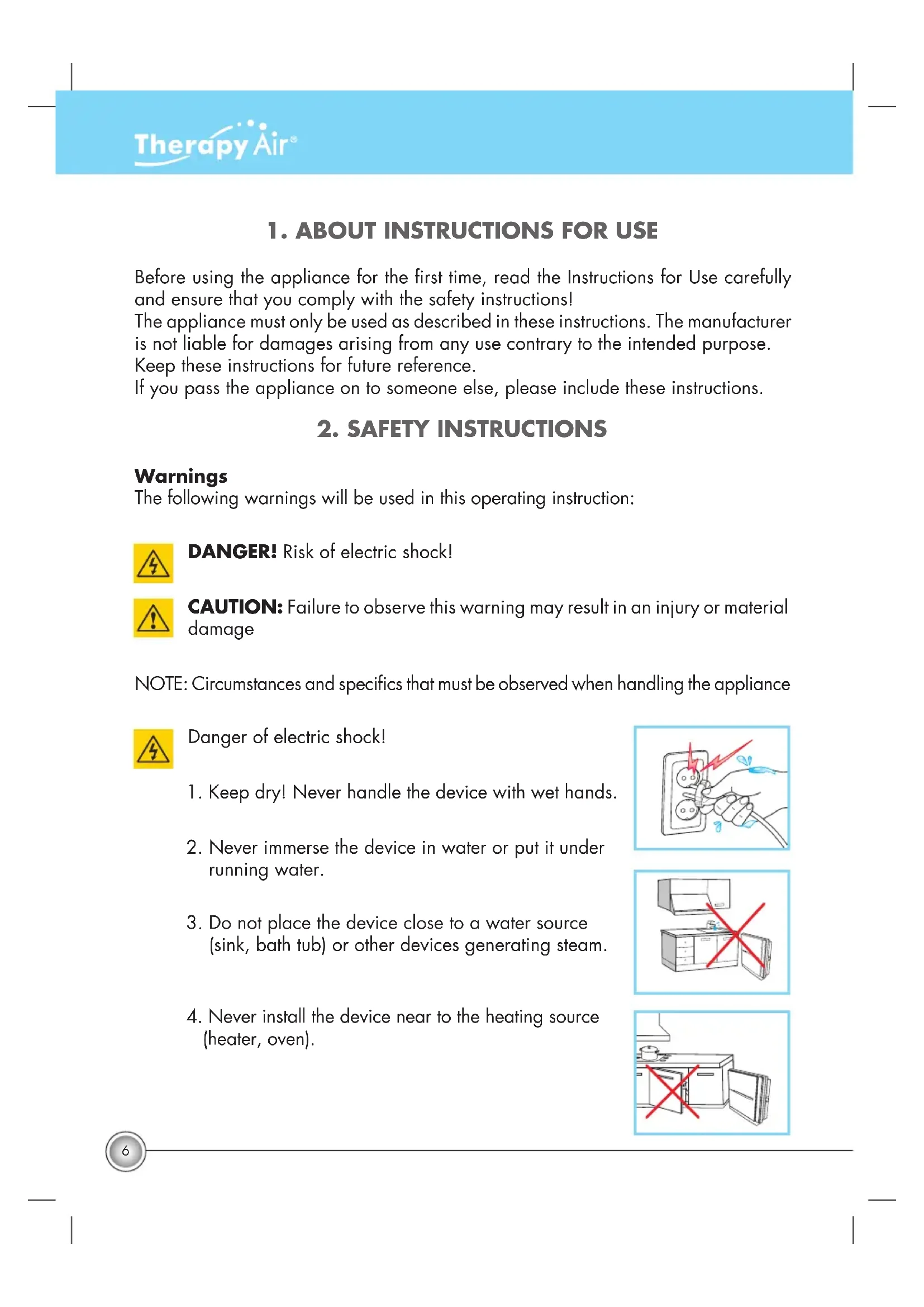 Warnings The following warnings will be used in this operating instruction: DANGER! Risk of electric shock! CAUTION: Failure to observe this warning may result in an injury or material damage NOTE: Circumstances and specifics that must be observed when handling the appliance Danger of electric shock!