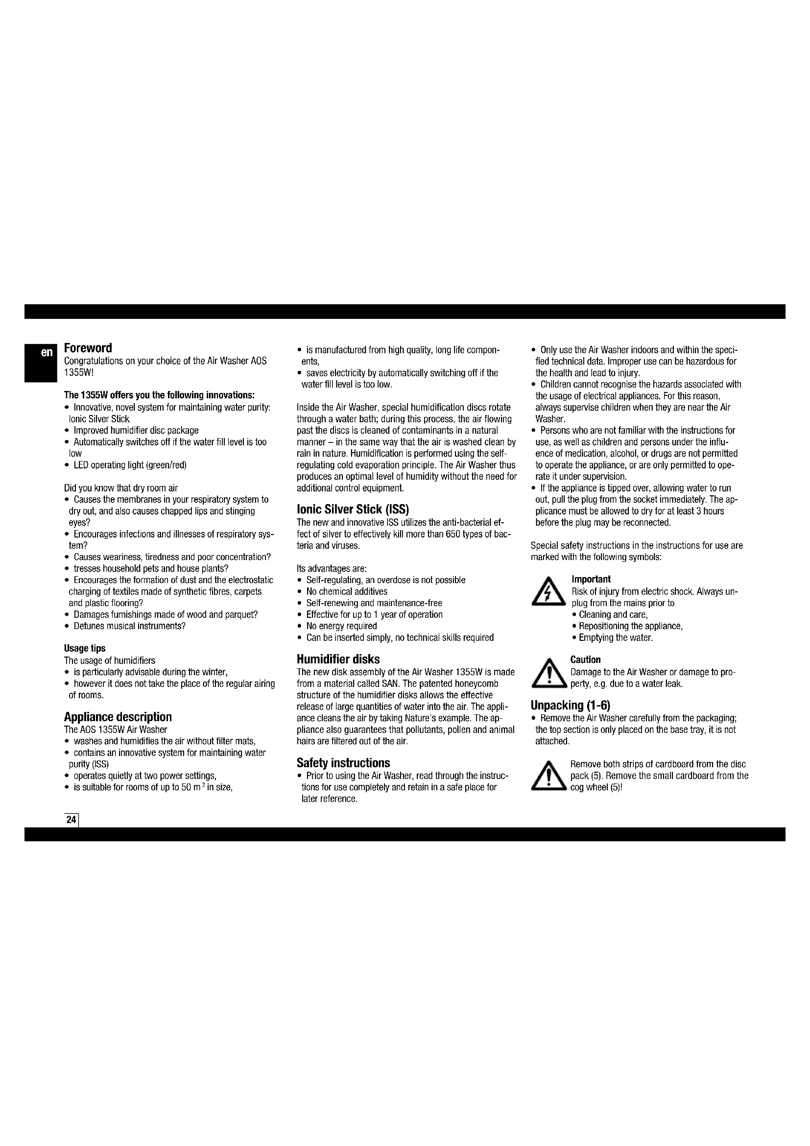 - Can be inserted simply, no technical skills required Humidifier disks The new disk assembly of the Air Washer 1355W is made from a material called SAN. The patented honeycomb structure of the humidifier disks allows the effective release of large quantities of water into the air. The appli- ance cleans the air by taking Nature’s example. The ap- pliance also guarantees that pollutants, pollen and animal hairs are filtered out of the air. Safety instructions