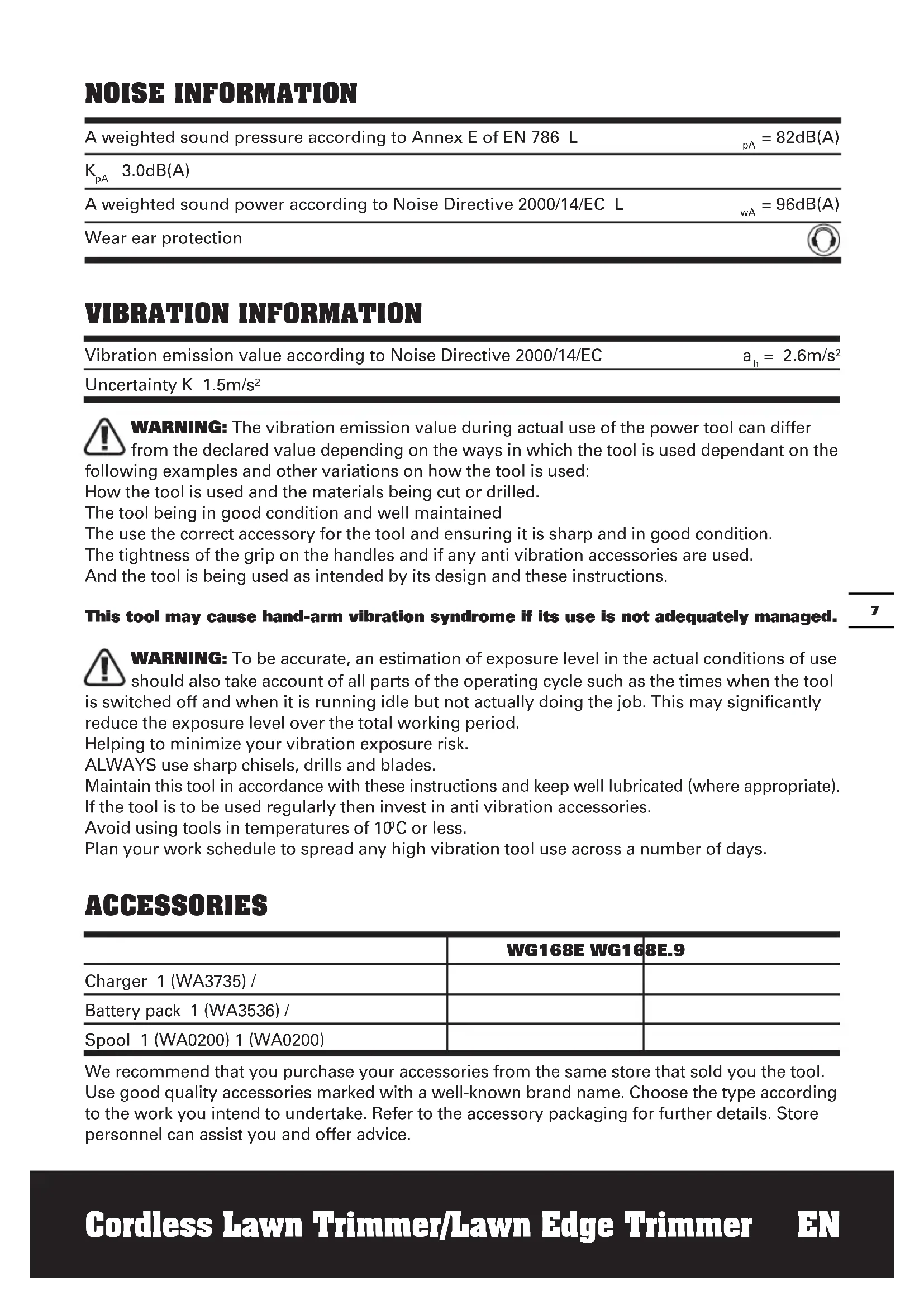C or less. Plan your work schedule to spread any high vibration tool use across a number of days. ACCESSORIES WG168E WG168E.9 Charger 1 (WA3735) / Battery pack 1 (WA3536) / Spool 1 (WA0200) 1 (WA0200) We recommend that you purchase your accessories from the same store that sold you the tool. Use good quality accessories marked with a well-known brand name. Choose the type according to the work you intend to undertake. Refer to the accessory packaging for further details. Store personnel can assist you and offer advice. VIBRATION INFORMATION Vibration emission value according to Noise Directive 2000/14/EC a