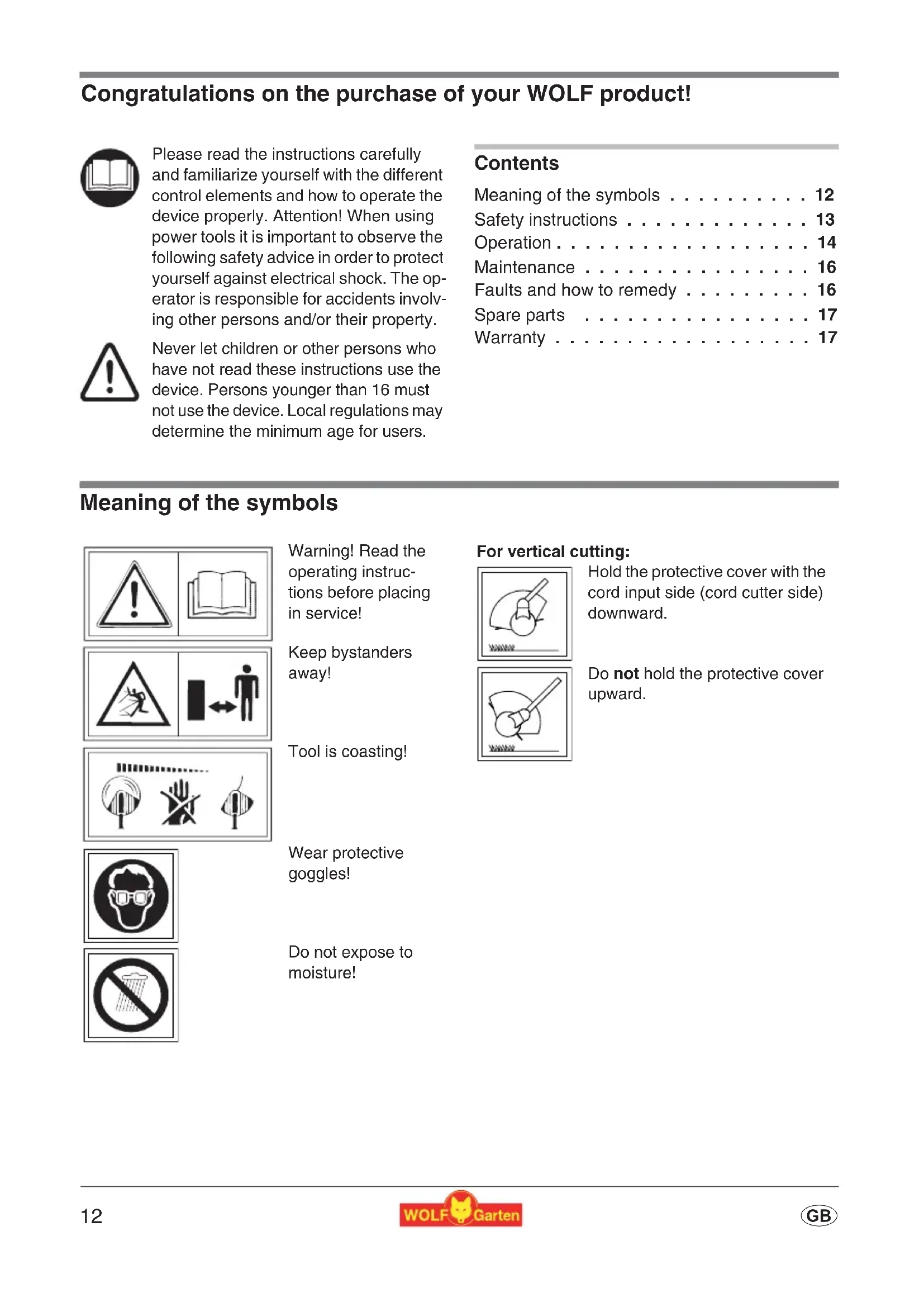 - Warranty Meaning of the symbols Please read the instructions carefully and familiarize yourself with the different control elements and how to operate the device properly. Attention! When using power tools it is important to observe the following safety advice in order to protect yourself against electrical shock. The op- erator is responsible for accidents involv- ing other persons and/or their property. Never let children or other persons who have not read these instructions use the device. Persons younger than 16 must not use the device. Local regulations may determine the minimum age for users. Warning! Read the operating instruc- tions before placing in service! Keep bystanders away! Tool is coasting! Wear protective goggles! Do not expose to moisture! For vertical cutting: Hold the protective cover with the cord input side (cord cutter side) downward. Do not hold the protective cover upward. Original operating instructions13 p. 17