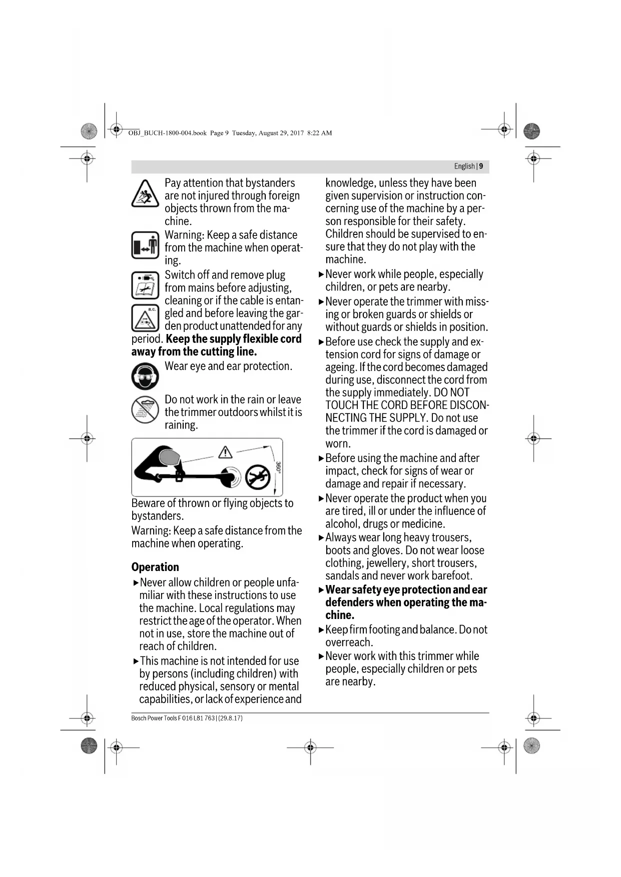NECTING THE SUPPLY. Do not use the trimmer if the cord is damaged or worn. Before using the machine and after impact, check for signs of wear or damage and repair if necessary. Never operate the product when you are tired, ill or under the influence of alcohol, drugs or medicine. Always wear long heavy trousers, boots and gloves. Do not wear loose clothing, jewellery, short trousers, sandals and never work barefoot. Wear safety eye protection and ear defenders when operating the ma- chine. Keep firm footing and balance. Do not overreach. Never work with this trimmer while people, especially children or pets are nearby. OBJ_BUCH-1800-004.book Page 9 Tuesday, August 29, 2017 8:22 AM10 | English F 016 L81 763 | (29.8.17) Bosch Power Tools The user is responsible for accidents or hazards occurring to other people or their property. Wait until the cutting head has com- pletely stopped before touching it. The head continues to rotate after the trimmer is switched off, the cutting system can cause injury/damage. Work only in daylight or in good artifi- cial light. Avoid operating the trimmer in bad weather conditions especially when there is a risk of lightning. Operating the trimmer in wet grass decreases the efficiency of perfor- mance. Switch off when transporting the trimmer to and from the area to be worked on. Switch on the trimmer with hands and feet well away from the rotating line. Caution – do not touch rotating cutting line. Do not put hands or feet near the cut- ting system. Never fit metal cutting elements to this trimmer. Inspect and maintain the trimmer regularly. Have the trimmer repaired only by an authorized customer service agent. Always ensure that the ventilation slots are kept clear of debris. Take care against injury from the blade fitted for cutting the nylon line length. After feeding line always re- turn the trimmer to its horizontal op- erating position before switching on. Switch off and remove the plug from the socket: – whenever you leave the machine unattended for any period – before replacing the cutting line – if the cable is tangled, – before cleaning or working on the trimmer After use, disconnect the machine from the mains and check for dam- age. Store the machine in a secure, dry place out of the reach of children. Do not place other objects on top of the machine. Replace worn or damaged parts for safety. Ensure replacement parts fitted are Bosch-approved. Do not operate the machine with- out the trimmer attachment fitted. Electrical Safety Warning! Switch off, remove plug from mains before adjusting, cleaning or if cable is cut, damaged or entangled. Your machine is double insulated for safety and requires no earth connec- tion. The operating voltage is 230 V AC, 50 Hz (for non-EU countries 220 V, 240 V as applicable). Only use ap- proved extension cables. Contact your Bosch Service Centre for details. For increased electrical safety use a Re- sidual Current Device (RCD) with a trip- ping current of not more than 30 mA. Always check your RCD every time you use it. OBJ_BUCH-1800-004.book Page 10 Tuesday, August 29, 2017 8:22 AMEnglish | 11 Bosch Power Tools F 016 L81 763 | (29.8.17) Keep the supply cables away from mov- ing hazardous parts and avoid damage to the cables; this can lead to contact with live parts. The connections (plugs and sockets) should be kept dry and off the ground. The supply cables must be inspected for signs of damage at regular intervals and may only be used if in perfect con- dition. If the supply cable on the product is damaged, it must only be replaced by a Bosch Service Centre. Only use approved extension cables. Extension cords, cables, leads, reels should only be used if they comply with EN 61242/IEC 61242 or IEC 60884-2-7. If you want to use an extension cable when operating your product, only the following cable dimensions should be used: – Nominal Conductor Area of