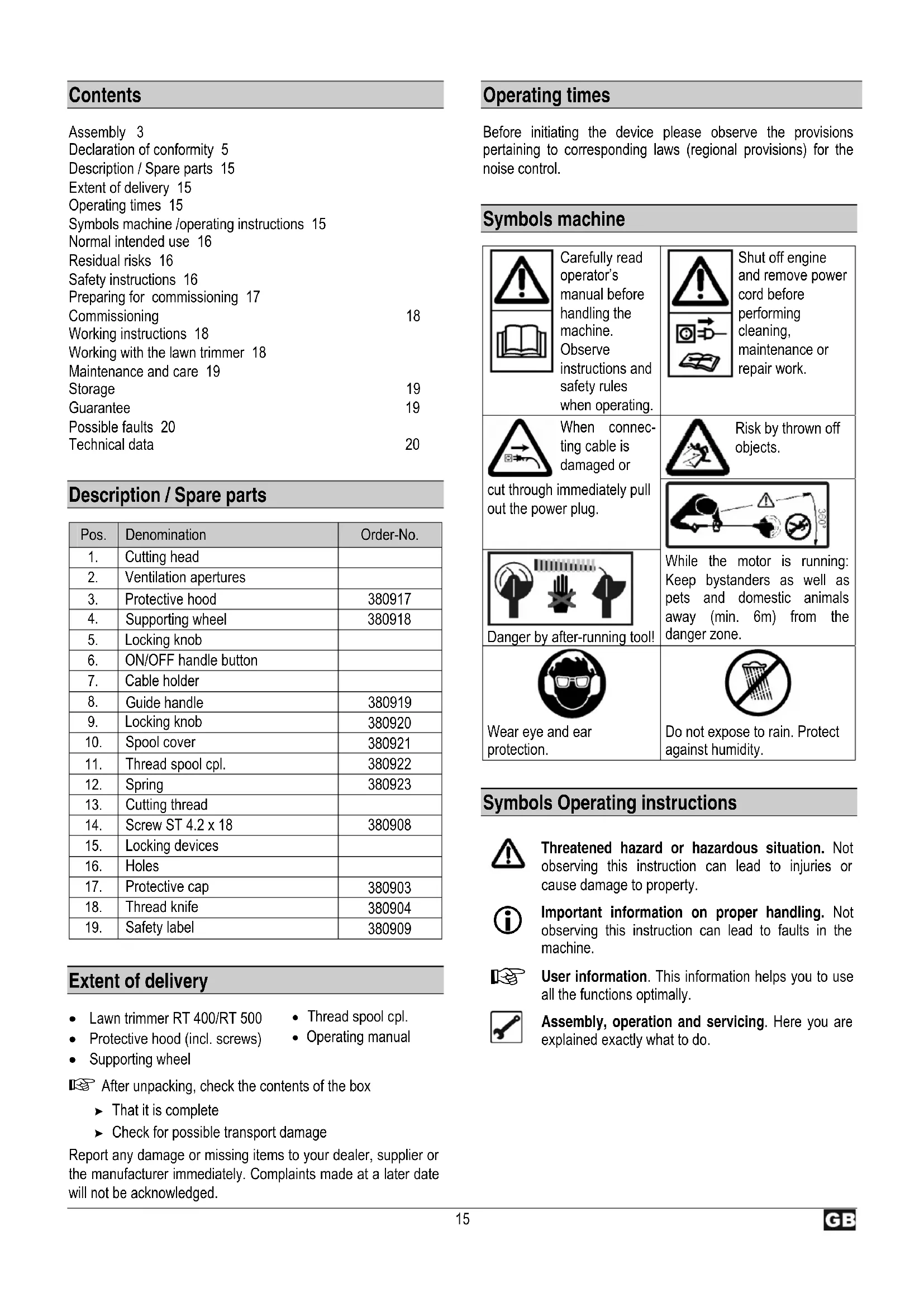 - Unauthorised modifications at the lawn trimmer will exempt the manufacturer from any liability for damages of any kind arising from this.