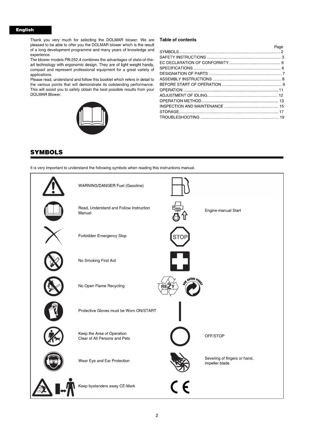 - English Thank you very much for selecting the DOLMAR blower. We are pleased to be able to offer you the DOLMAR blower which is the result of a long development programme and many years of knowledge and experience. The blower models PB-252.4 combines the advantages of state-of-the- art technology with ergonomic design. They are of light weight handy, compact and represent professional equipment for a great variety of applications. Please read, understand and follow this booklet which refers in detail to the various points that will demonstrate its outstanding performance. This will assist you to safety obtain the best possible results from your DOLMAR Blower. Table of contents Page SYMBOLS p. 2
