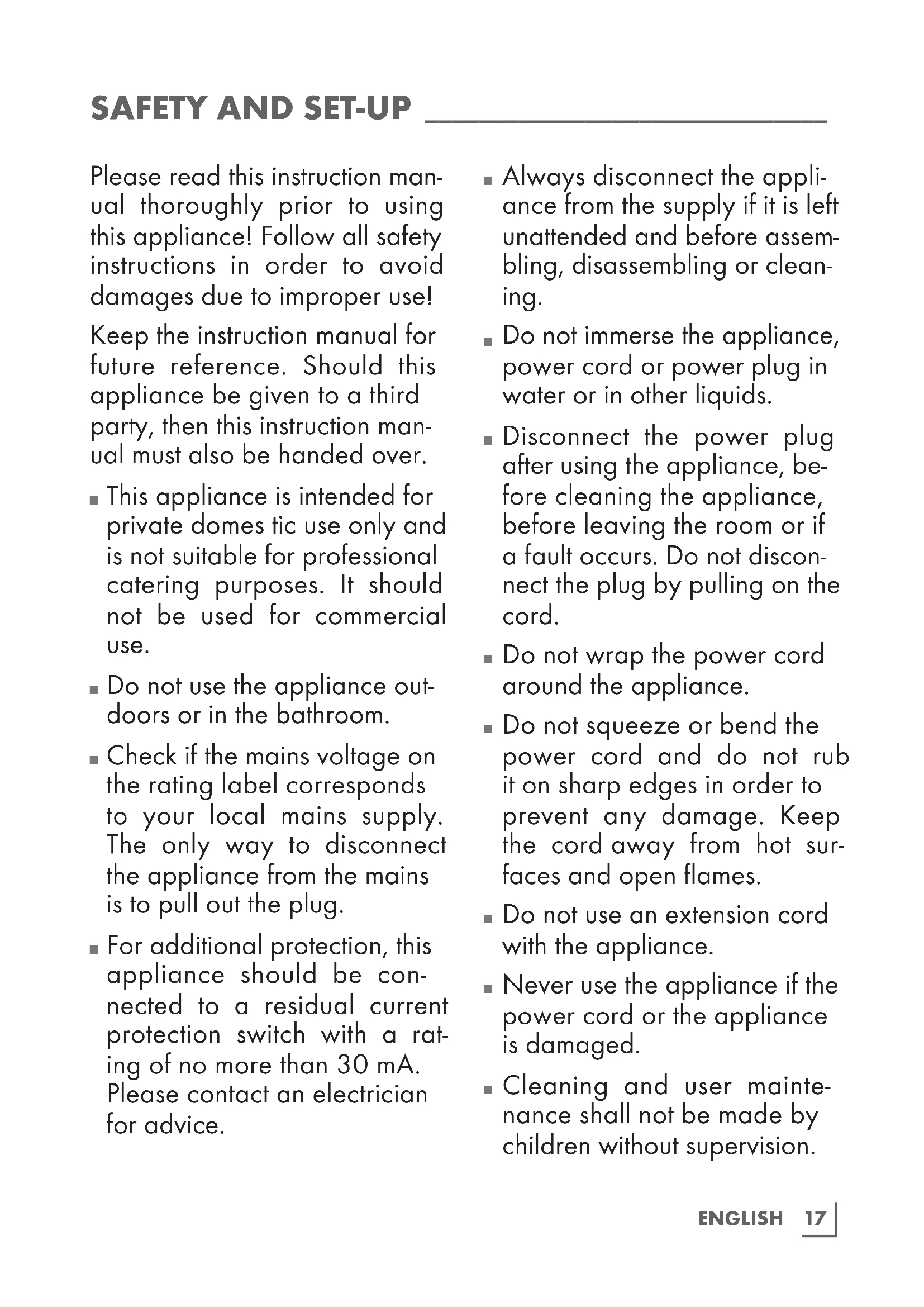 Please read this instruction man- ual thoroughly prior to using this appliance! Follow all safety instructions in order to avoid damages due to improper use! Keep the instruction manual for future reference. Should this appliance be given to a third party, then this instruction man- ual must also be handed over.