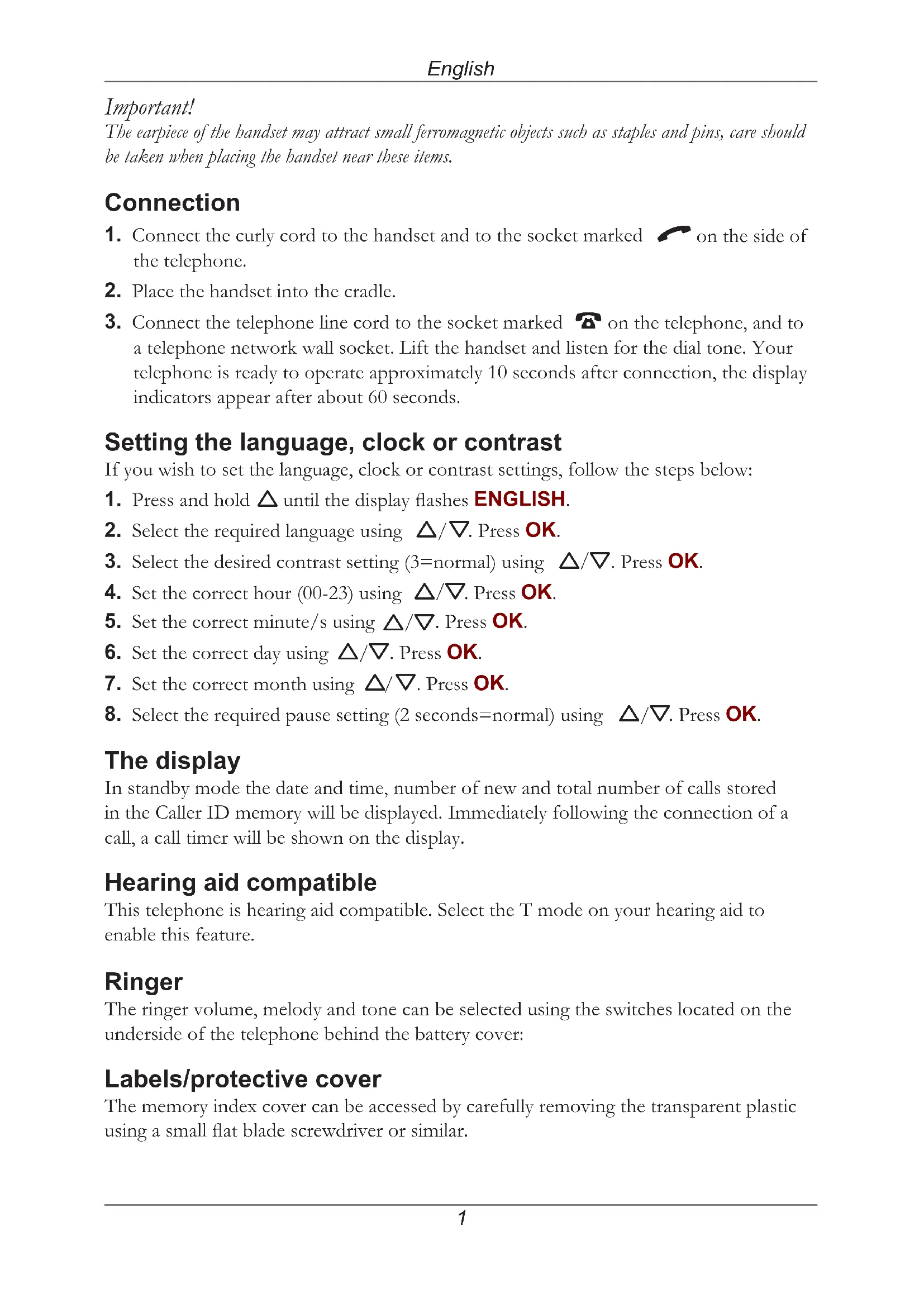 . Press OK. The display In standby mode the date and time, number of new and total number of calls stored in the Caller ID memory will be displayed. Immediately following the connection of a call, a call timer will be shown on the display. Hearing aid compatible This telephone is hearing aid compatible. Select the T mode on your hearing aid to enable this feature. Ringer The ringer volume, melody and tone can be selected using the switches located on the underside of the telephone behind the battery cover: Labels/protective cover The memory index cover can be accessed by carefully removing the transparent plastic using a small at blade screwdriver or similar.English