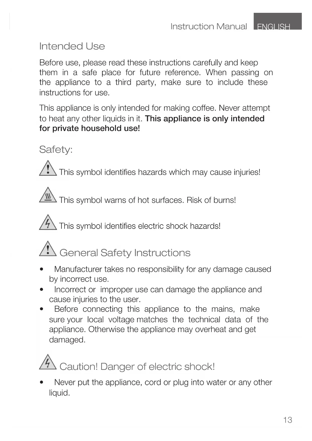 Intended Use Before use, please read these instructions carefully and keep them in a safe place for future reference. When passing on the appliance to a third party, make sure to include these instructions for use. This appliance is only intended for making coffee. Never attempt to heat any other liquids in it. This appliance is only intended for private household use! Safety: This symbol identifies hazards which may cause injuries! This symbol warns of hot surfaces. Risk of burns! This symbol identifies electric shock hazards! General Safety Instructions
