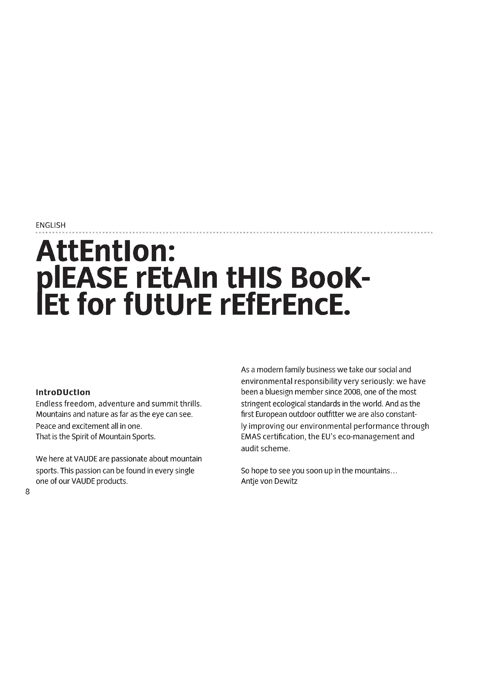 - Spannen Sie die Abspannleinen nicht auf Fußwegen ab, in der Dunkelheit werden sie schnell zu Stolperfallen.8 ENGLISH AttEntIon: plEASE rEtAIn tHIS BooK- lEt for fUtUrE rEfErEncE. As a modern family business we take our social and environmental responsibility very seriously: we have been a bluesign member since 2008, one of the most stringent ecological standards in the world. And as the first European outdoor outfitter we are also constant- ly improving our environmental performance through EMAS certification, the EU’s eco-management and audit scheme. So hope to see you soon up in the mountains… Antje von Dewitz IntroDUctIon Endless freedom, adventure and summit thrills. Mountains and nature as far as the eye can see. Peace and excitement all in one. That is the Spirit of Mountain Sports. We here at VAUDE are passionate about mountain sports. This passion can be found in every single one of our VAUDE products.9 ENGLISH cHooSIng YoUr SItE: