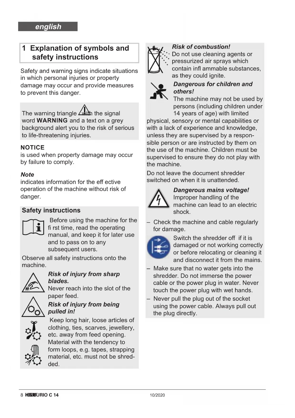 english10 SECURIO C 14 10/2020 5 Initial start-up WARNING Dangerous mains voltage! Improper handling of the machine can lead to an electric shock. – Only use the machine in a dry room indoors. Never operate the machine in damp rooms or in the rain. – Keep the machine, the plug and cable away from open fi re and hot surfaces. The ventilation slots must not be blocked or covered and there must be at least 5 cm space between the shredder and any wall or furniture. – Make sure that the power plug is easily accessible. – Before you insert the power plug, make sure that the voltage and frequency of your power supply comply with the information on the name plate. 6 Operation