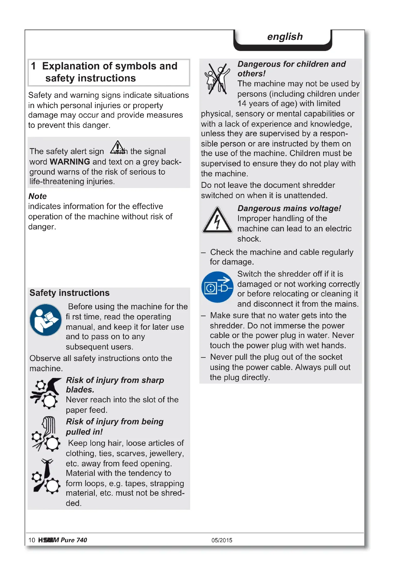 Gewicht 50 kg 56 kg Schnittgeschwindigkeit 70 mm/s 60 mm/s Eingabebreite 400 mm Anschluss 230 V, 50 Hz 120 V, 60 Hz 220 V, 60 Hz Leistungsaufnahme bei max. Blattzahl 590 W Betriebsart Dauerbetrieb Umgebungsbedingungen im Betrieb: Temperatur relative Luftfeuchte Höhe über NN -10 °C bis +25 °C max. 90 %, nicht kondensierend max. 2 000 m Maße B x T x H (mm) 620 x 487 x 889 Volumen des Schnittgutbehälters 145 l Emissionsschalldruckpegel (im Leerlauf / unter Last) 56 dB(A) / 59-63 dB(A)10 HSM Pure 740 05/2015 english 1 Explanation of symbols and safety instructions Safety and warning signs indicate situations in which personal injuries or property damage may occur and provide measures to prevent this danger. Note indicates information for the effective operation of the machine without risk of danger. The safety alert sign with the signal word WARNING and text on a grey back- ground warns of the risk of serious to life-threatening injuries. Safety instructions Before using the machine for the fi rst time, read the operating manual, and keep it for later use and to pass on to any subsequent users. Observe all safety instructions onto the machine. Risk of injury from sharp blades. Never reach into the slot of the paper feed. Risk of injury from being pulled in! Keep long hair, loose articles of clothing, ties, scarves, jewellery, etc. away from feed opening. Material with the tendency to form loops, e.g. tapes, strapping material, etc. must not be shred- ded. Dangerous for children and others! The machine may not be used by persons (including children under 14 years of age) with limited physical, sensory or mental capabilities or with a lack of experience and knowledge, unless they are supervised by a respon- sible person or are instructed by them on the use of the machine. Children must be supervised to ensure they do not play with the machine. Do not leave the document shredder switched on when it is unattended. Dangerous mains voltage! Improper handling of the machine can lead to an electric shock. – Check the machine and cable regularly for damage. Switch the shredder off if it is damaged or not working correctly or before relocating or cleaning it and disconnect it from the mains. – Make sure that no water gets into the shredder. Do not immerse the power cable or the power plug in water. Never touch the power plug with wet hands. – Never pull the plug out of the socket using the power cable. Always pull out the plug directly.05/2015 HSM Pure 740 11 english 2 Proper use, warranty The warranty period for the document shredder is 2 years. There is a special war- ranty for the HSM solid steel cutting rollers in the document shredder, which is pro- vided independently of the guarantee, and remains valid for the entire service life of the machine (HSM Lifetime Warranty). This warranty and guarantee exclude wear and damage caused by improper handling or actions taken by third parties. HSM guarantees the delivery of spare parts for up to 10 years after the production of this model has been discontinued. The document shredder is intended for shredding paper and small quantities of CDs/DVDs and credit cards or store cards. Its sturdy drive mechanism is not damaged by paper clips and staples. Operating and display elements Display option Container full Display option Ready for operation Display option Cutting unit blocked Door open / Safety element pressed Operation button Reverse button 3 Overview 1 Door 2 Safety instructions 3 Light barrier 4 Operating and display unit 5 Safety element 6 Name plate 7 Mains switch 1 2 3 4 5 6 712 HSM Pure 740 05/2015 english 4 Initial start-up WARNING Dangerous mains voltage! Improper handling of the machine can lead to an electric shock. – Only use the machine in a dry room indoors. Never operate the machine in damp rooms or in the rain. – Keep the machine, the plug and cable away from open fi re and hot surfaces. The ventilation slots must not be blocked or covered and there must be at least 5 cm space between the shredder and any wall or furniture. – Make sure that the power plug is easily accessible. – Before you insert the power plug, make sure that the voltage and frequency of your power supply comply with the information on the name plate. 5 Operation