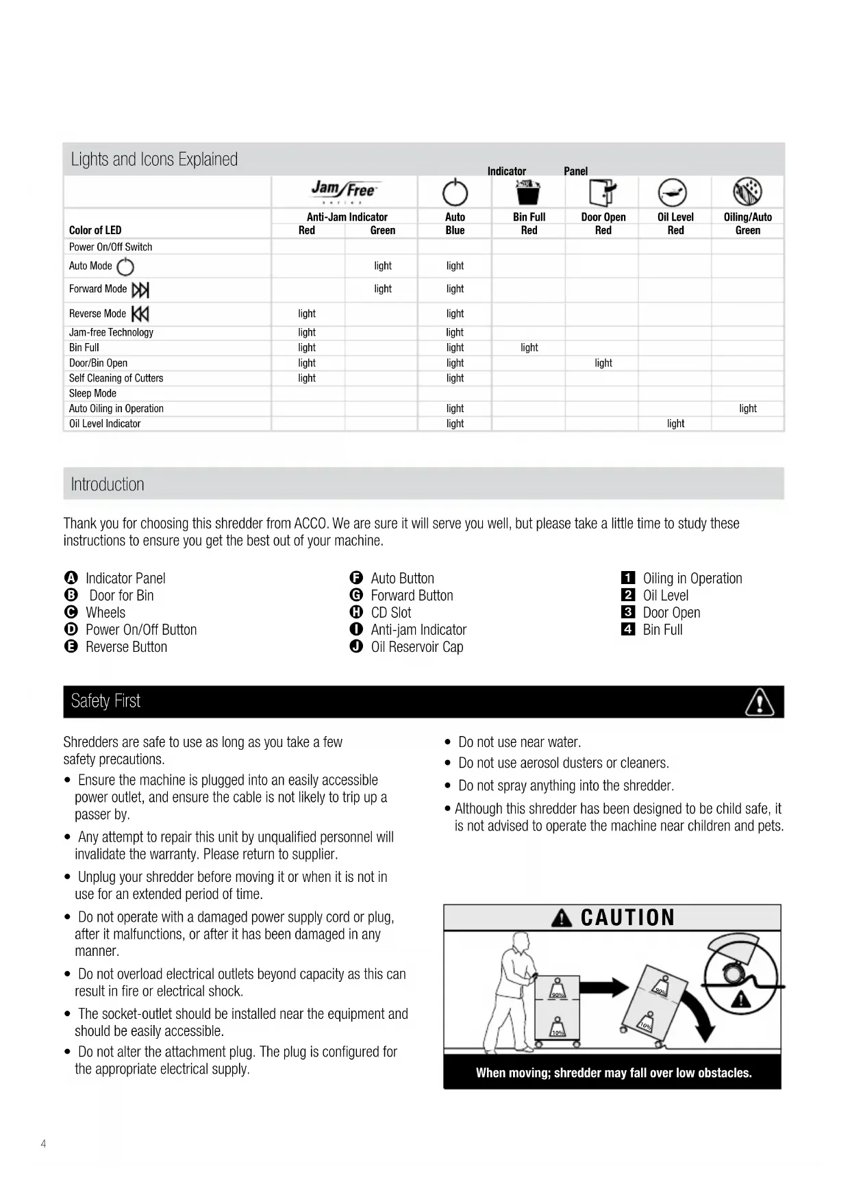 Bin Full Lights and Icons Explained Indicator Panel Anti-Jam Indicator Auto Bin Full Door Open Oil Level Oiling/Auto Color of LED Red Green Blue Red Red Red Green Power On/Off Switch Auto Mode light light Forward Mode light light Reverse Mode light light Jam-free Technology light light Bin Full light light light Door/Bin Open light light light Self Cleaning of Cutters light light Sleep Mode Auto Oiling in Operation light light Oil Level Indicator light light Safety First 90% 10% 90% 10% CAUTION When moving; shredder may fall over low obstacles.5 Door Open Protection If the door is opened during shredding, as a precaution the shredder will instantly stop, and the door open symbol on the indicator panel will ash red. To turn back to auto mode simply press the auto button again (F). Shredder Control Panel CAUTION ReverseForwardAuto Safety First - Read instructions before use. This means you should be careful because long hair can become entangled in the cutting head. This could hurt you. This means don’t reach into the feed opening of the cutting head. This could hurt you. This means be careful of ties and other loose clothing which could become entangled in the cutting head. This could hurt you. This means be careful of loose jewelry which could become entangled in the cutting head. This means keep children away from shredder. This means do not shred CD’s. Non-Stop Jam Free Anti-Jam Technology Swingline Shredders will only shred stacks of paper that are within the shredders sheet capacity. For example, a shredder with a capacity of 22 sheets will not allow the shredding of more sheets than this. Sensors in the paper feed area measure the thickness of paper about to be shredded. The ability to shred or not is communicated through red and green lighting. Green means that the stack of paper is within the shredders sheet capacity and OK to shred. Red means that you have too much paper, remove some sheets in order to shred. Given that you are unable to shred more sheets of paper than the shredder is capable of shredding, paper jams are prevented. This prevents time wasted through reversing paper and unblocking jams not to mention the mess it can create. Rare Occasions of Jamming In the unlikely event of the shredder jamming, use the reverse function to unblock the shredder. Alternating between the reverse and forward functions will help unblock the feed area. This means oil level. This means oiling in operation. Initial Setup of SelfOil™ The shredder is designed to automatically lubricate the cutting mechanism as required to ensure the product continues to work to its maximum performance and to extend the product life. Before turning on the machine for the rst time, please open the oil reservoir cap on the head of the shredder (J) and pour in the 60ml bottle of oil provided as standard. This is sufcient to allow the shredder to start for the rst time and to operate continuously for approximately one hour of shredding before the reservoir will need relling. Press and hold down the Auto button (F) for 5 seconds to start the pump and prime the system. This operation is only required the very rst time the shredder is used. When the ‘Oil Rell’ indicator is illuminated , ip up the oil reservoir cap (J) and rell the oil reservoir using a bottle of standard Swingline oil (1760049). The automatic oiling operation lasts approximately 2 seconds and you will hear the distribution pump during this time. Auto- oiling operates after 15 minutes of shredding. This means do not shred credit cards. We only recommend the use of Swingline shredder lubricant to maintain optimum performance and safety. ACCO accepts no liability for product performance or safety if anything other than Swingline branded shredder lubricant is used (Order Code 1760049). WARNING Do not use flammable oil. Only Swingline part number 1760049 is recommended.Operation