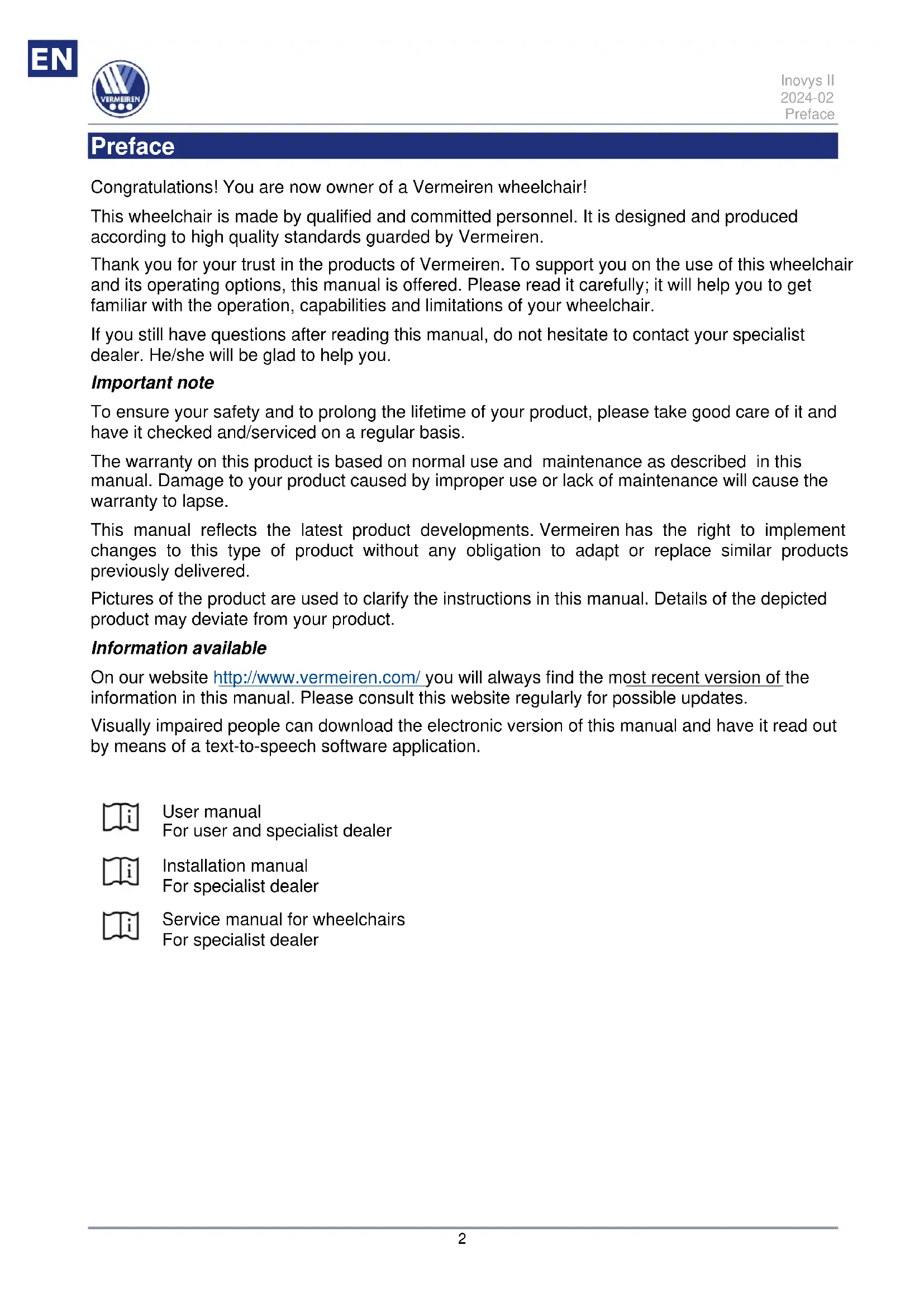 Preface Congratulations! You are now owner of a Vermeiren wheelchair! This wheelchair is made by qualified and committed personnel. It is designed and produced according to high quality standards guarded by Vermeiren. Thank you for your trust in the products of Vermeiren. To support you on the use of this wheelchair and its operating options, this manual is offered. Please read it carefully; it will help you to get familiar with the operation, capabilities and limitations of your wheelchair. If you still have questions after reading this manual, do not hesitate to contact your specialist dealer. He/she will be glad to help you. Important note To ensure your safety and to prolong the lifetime of your product, please take good care of it and have it checked and/serviced on a regular basis. The warranty on this product is based on normal use and maintenance as described in this manual. Damage to your product caused by improper use or lack of maintenance will cause the warranty to lapse. This manual reflects the latest product developments. Vermeiren has the right to implement changes to this type of product without any obligation to adapt or replace similar products previously delivered. Pictures of the product are used to clarify the instructions in this manual. Details of the depicted product may deviate from your product. Information available On our website http://www.vermeiren.com/ you will always find the most recent version of the information in this manual. Please consult this website regularly for possible updates. Visually impaired people can download the electronic version of this manual and have it read out by means of a text-to-speech software application.