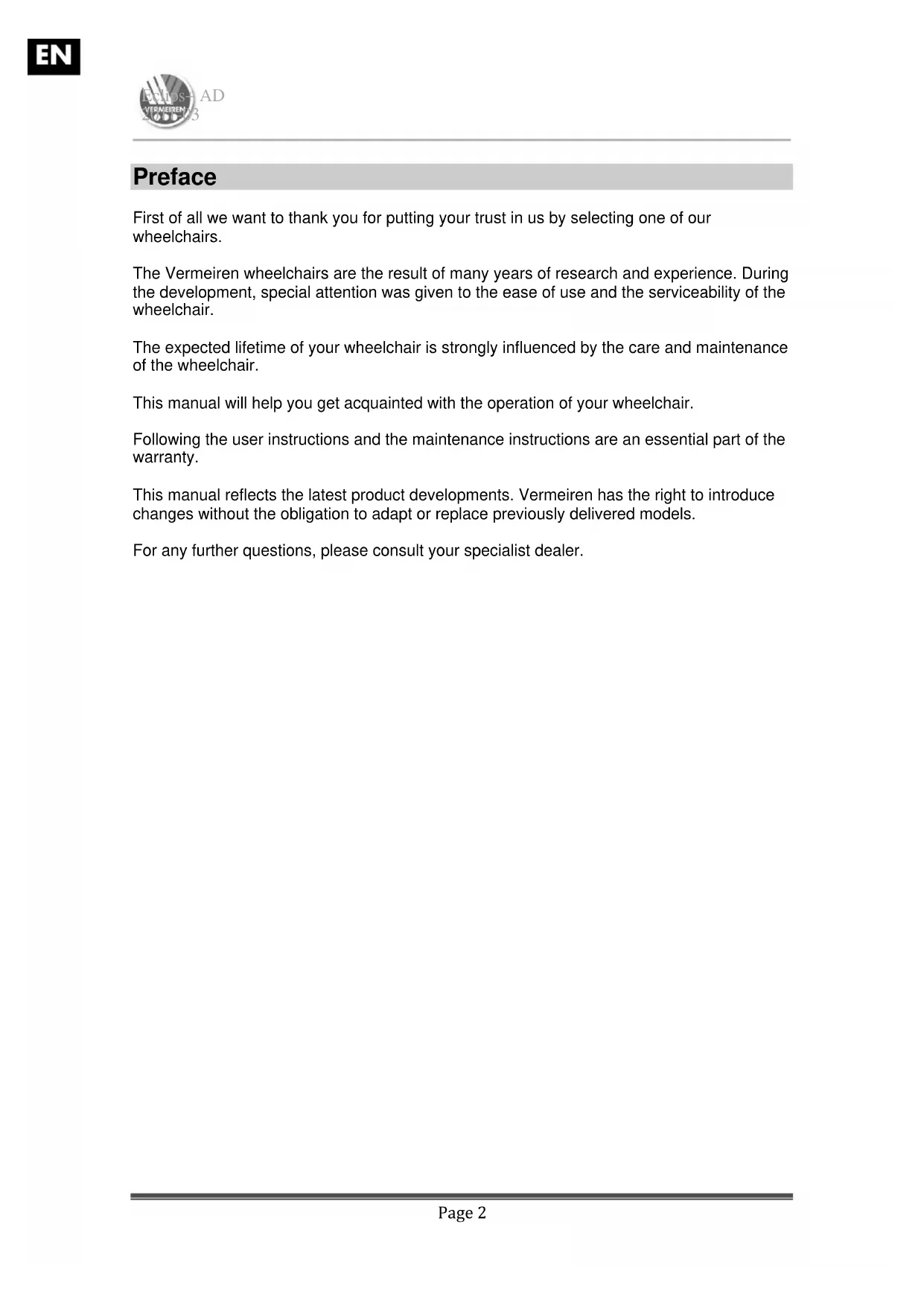 Preface First of all we want to thank you for putting your trust in us by selecting one of our wheelchairs. The Vermeiren wheelchairs are the result of many years of research and experience. During the development, special attention was given to the ease of use and the serviceability of the wheelchair. The expected lifetime of your wheelchair is strongly influenced by the care and maintenance of the wheelchair. This manual will help you get acquainted with the operation of your wheelchair. Following the user instructions and the maintenance instructions are an essential part of the warranty. This manual reflects the latest product developments. Vermeiren has the right to introduce changes without the obligation to adapt or replace previously delivered models. For any further questions, please consult your specialist dealer.EN Eclips+ AD 2011-03