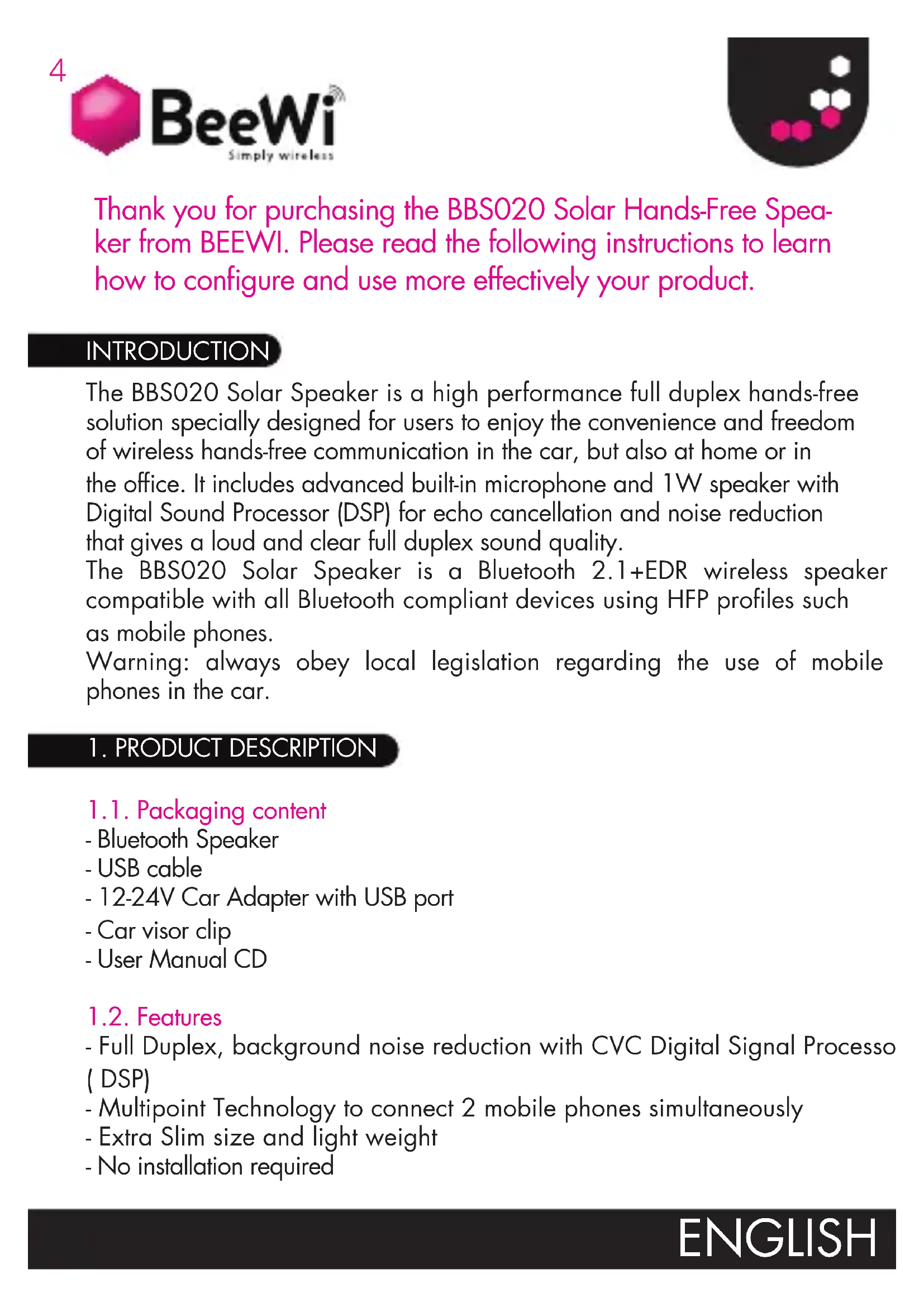 phones in the car. 1.1. Packaging content - Bluetooth Speaker - USB cable - 12-24V Car Adapter with USB port - Car visor clip - User Manual CD 1.2. Features - Full Duplex, background noise reduction with CVC Digital Signal Processor ( DSP) - Multipoint Technology to connect 2 mobile phones simultaneously - Extra Slim size and light weight - No installation required INTRODUCTION Thank you for purchasing the BBS020 Solar Hands-Free Spea- ker from BEEWI. Please read the following instructions to learn how to configure and use more effectively your product. ENGLISH