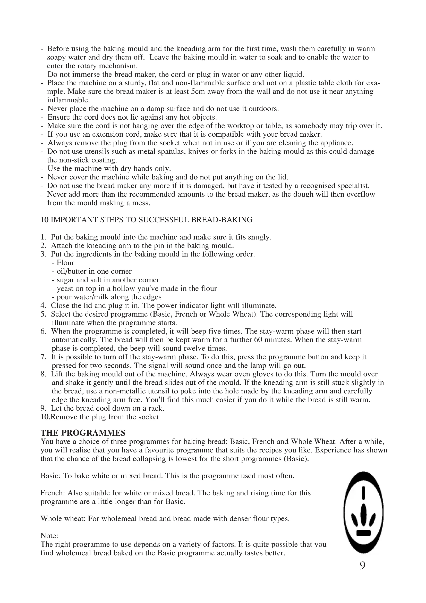 10.Remove the plug from the socket. THE PROGRAMMES You have a choice of three programmes for baking bread: Basic, French and Whole Wheat. After a while, you will realise that you have a favourite programme that suits the recipes you like. Experience has shown that the chance of the bread collapsing is lowest for the short programmes (Basic). Basic: To bake white or mixed bread. This is the programme used most often. French: Also suitable for white or mixed bread. The baking and rising time for this programme are a little longer than for Basic. Whole wheat: For wholemeal bread and bread made with denser flour types. Note: The right programme to use depends on a variety of factors. It is quite possible that you find wholemeal bread baked on the Basic programme actually tastes better.10 BAKING TIMES Programme: Basic: French Whole wheat (minutes) (minutes) (minutes) Kneading 15 15 20 Rising 20 25 35 Baking 40 50 45 Total programme time 75 90 100 Stay-warm phase 60 60 60