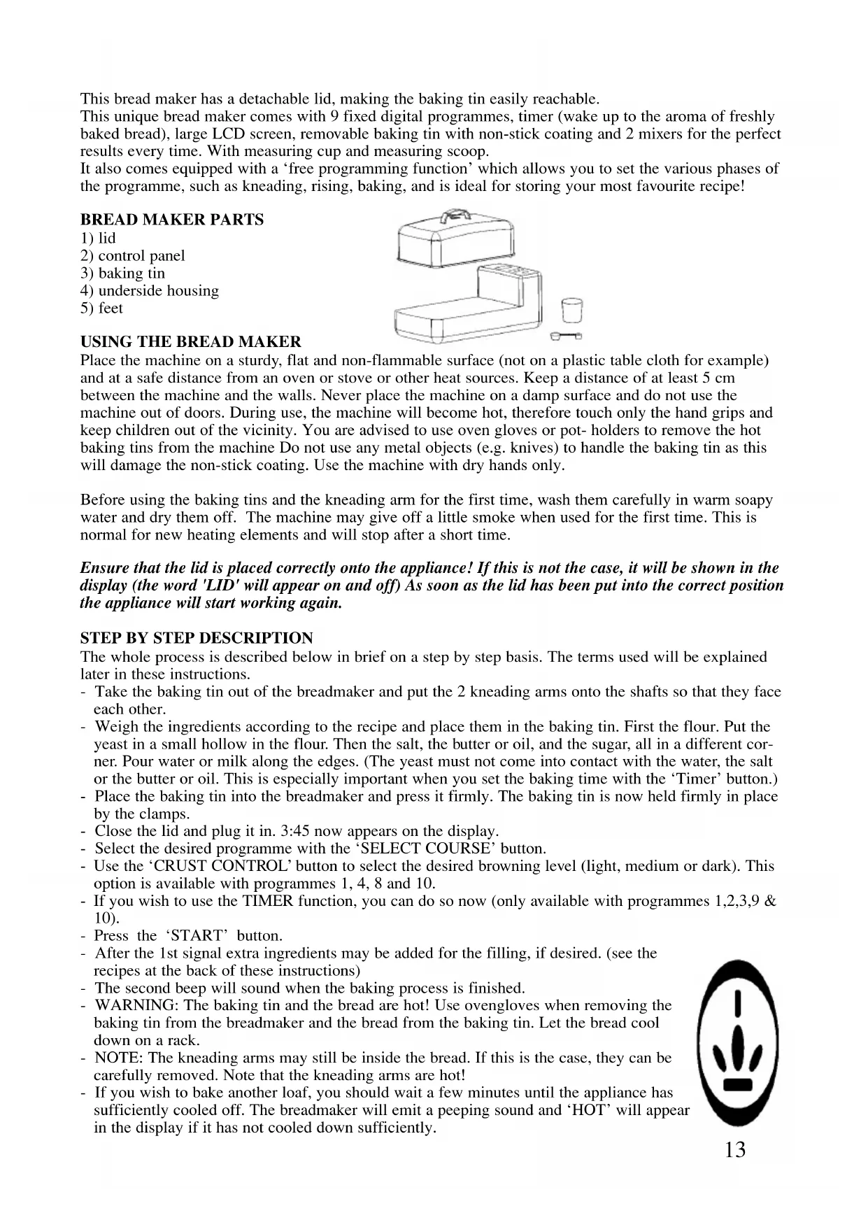 Read these instructions thoroughly first and keep them for future reference. Check that your domestic electricity supply matches that of the appliance. Only connect this appliance to an earthed socket. This fully automatic bread maker mixes and kneads the dough, bakes the bread and then switches to the stay-warm function (to keep the bread appetisingly fresh and crispy). Fresh bread every time, just as you like it. Also suitable for special diets. Crust colour can be set to light, medium and dark.13 This bread maker has a detachable lid, making the baking tin easily reachable. This unique bread maker comes with 9 fixed digital programmes, timer (wake up to the aroma of freshly baked bread), large LCD screen, removable baking tin with non-stick coating and 2 mixers for the perfect results every time. With measuring cup and measuring scoop. It also comes equipped with a ‘free programming function’ which allows you to set the various phases of the programme, such as kneading, rising, baking, and is ideal for storing your most favourite recipe!