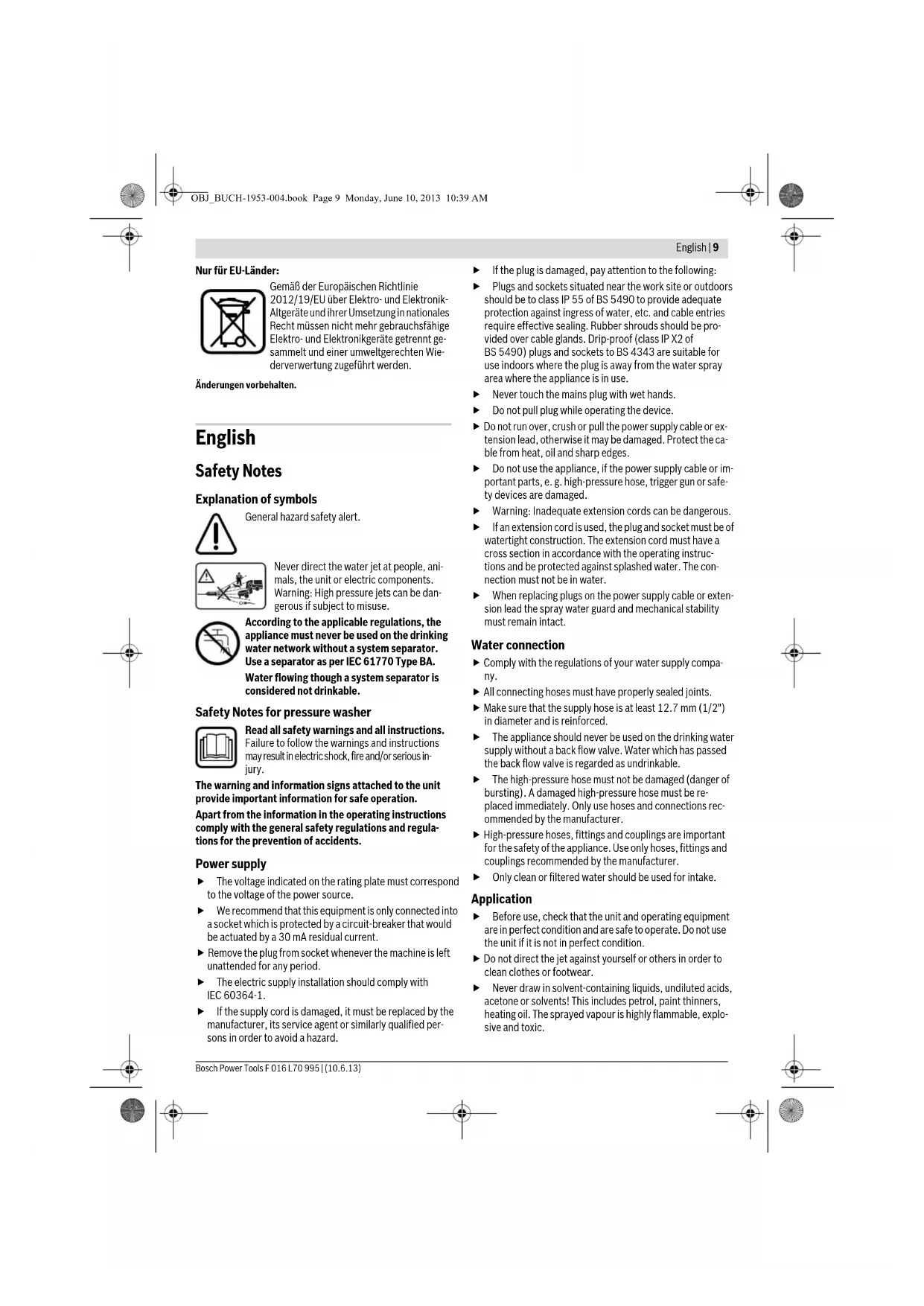 If an extension cord is used, the plug and socket must be of watertight construction. The extension cord must have a cross section in accordance with the operating instruc- tions and be protected against splashed water. The con- nection must not be in water. When replacing plugs on the power supply cable or exten- sion lead the spray water guard and mechanical stability must remain intact. Water connection Comply with the regulations of your water supply compa- ny. All connecting hoses must have properly sealed joints. Make sure that the supply hose is at least 12.7 mm (1/2") in diameter and is reinforced. The appliance should never be used on the drinking water supply without a back flow valve. Water which has passed the back flow valve is regarded as undrinkable. The high-pressure hose must not be damaged (danger of bursting). A damaged high-pressure hose must be re- placed immediately. Only use hoses and connections rec- ommended by the manufacturer. High-pressure hoses, fittings and couplings are important for the safety of the appliance. Use only hoses, fittings and couplings recommended by the manufacturer. Only clean or filtered water should be used for intake. Application Before use, check that the unit and operating equipment are in perfect condition and are safe to operate. Do not use the unit if it is not in perfect condition. Do not direct the jet against yourself or others in order to clean clothes or footwear. Never draw in solvent-containing liquids, undiluted acids, acetone or solvents! This includes petrol, paint thinners, heating oil. The sprayed vapour is highly flammable, explo- sive and toxic. OBJ_BUCH-1953-004.book Page 9 Monday, June 10, 2013 10:39 AM10 | English F 016 L70 995 | (10.6.13) Bosch Power Tools The appropriate safety regulations must be observed when using the unit in dangerous areas (e.g. petrol sta- tions). It is forbidden to operate the unit in potentially ex- plosive locations. The unit must be placed on a solid base. Only use detergents recommended by the manufacturer and comply with the application, disposal and warning in- structions of the detergent manufacturers. All current-conducting components in the working area must be protected against splashed water. The gun trigger must not be jammed in position “ON” dur- ing operation. Wear suitable protective clothing to protect against splashing from some parts. Do not use the appliance within the range of persons unless they also wear protective clothing. If necessary wear personal protective equipment (PPE) e. g. safety goggles, breathing protection etc to protect against water, particles and/or aerosols sprayed back from parts. High pressure may cause objects to rebound. If necessary wear suitable personnel protective equipment such as safety goggles. Vehicle tyres/tyre valves may only be cleaned from a mini- mum distance of 30 cm, otherwise the vehicle tyre/tyre valve could be damaged by the high-pressure jet. The first indication of this is a discoloration of the tyre. Damaged vehicle tyres/tyre valves can be extremely dangerous. Materials containing asbestos and other materials which contain substances which are hazardous to your health must not be sprayed. Detergents must not be used undiluted. The products are safe to use as they contain no acids, alkalis or substances which are detrimental to the environment. We recommend that the detergents are kept out of the reach of children. If detergent comes into contact with the eyes, wash immedi- ately with plenty of water and if swallowed contact a doctor immediately. Never use the pressure washer without the filter or with a dirty or damaged filter. Using the pressure washer without a filter or with a dirty or damaged filter may invali- date the warranty. Metal parts may become hot after prolonged usage, if nec- essary wear protective gloves. Avoid high pressure washing in bad weather conditions es- pecially when there is a risk of lightning. Operation The operator must use the unit in accordance with the reg- ulations. He/she must take local conditions into account and be aware of other people, especially children, when operating the unit. The unit may only be used by authorised persons who have received training or have demonstrated their ability to op- erate the unit. The unit must not be operated by children or juveniles (danger of accidents due to incorrect use of the unit). Children should be supervised to ensure that they do not play with the appliance. This machine can be used by people with reduced physi- cal, sensory or mental capabilities or lack of experience and knowledge if they have been given supervision or in- struction concerning use of the machine in a safe way and understand the hazards involved. The unit must never be left unsupervised while the unit is switched on. The water jet from the high-pressure nozzle produces a re- coil on the gun. You should therefore hold the gun and spray lance firmly with both hands. Transport Switch off the motor and secure the unit before transport- ing. Maintenance Switch off the unit prior to all cleaning and maintenance work and before replacing components. Pull out the mains plug if the unit is mains-operated. Repairs may only be carried out by authorised Bosch Ser- vice Centres. Accessories and spare parts Only use accessories and spare parts which have been ap- proved by Bosch. Original accessories and spare parts guarantee that the unit can be operated safely and without any breakdowns. Symbols The following symbols are important for reading and under- standing the operating instructions. Please take note of the symbols and their meaning. The correct interpretation of the symbols will help you to use the machine in a better and safer manner. Intended Use The product is intended for cleaning areas and objects out- side the house, tools, vehicles and boats, if the appropriate accessories such as cleaning agents approved by Bosch are used. Intended use is related to operation within 0°C