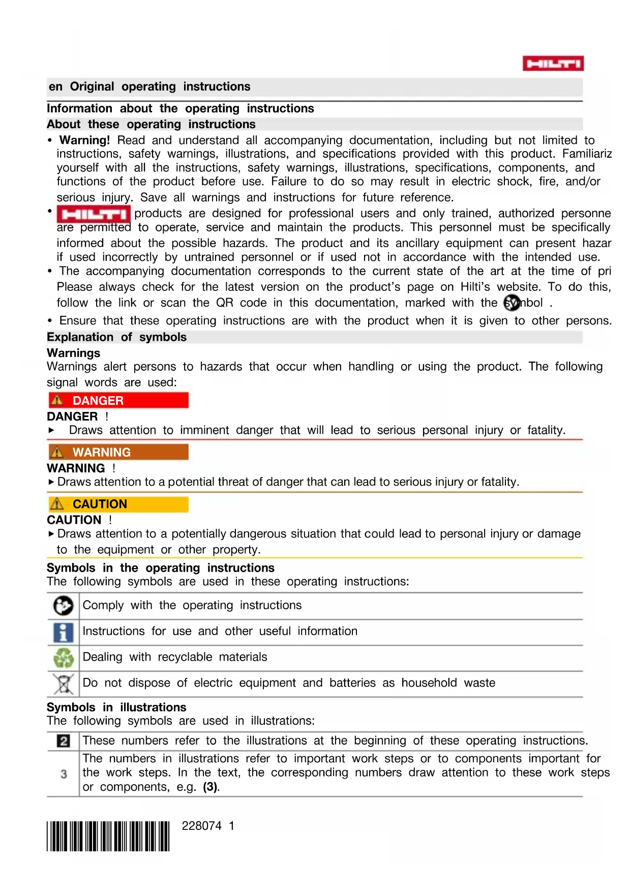 - The accompanying documentation corresponds to the current state of the art at the time of printing. Please always check for the latest version on the product’s page on Hilti’s website. To do this, follow the link or scan the QR code in this documentation, marked with the symbol .