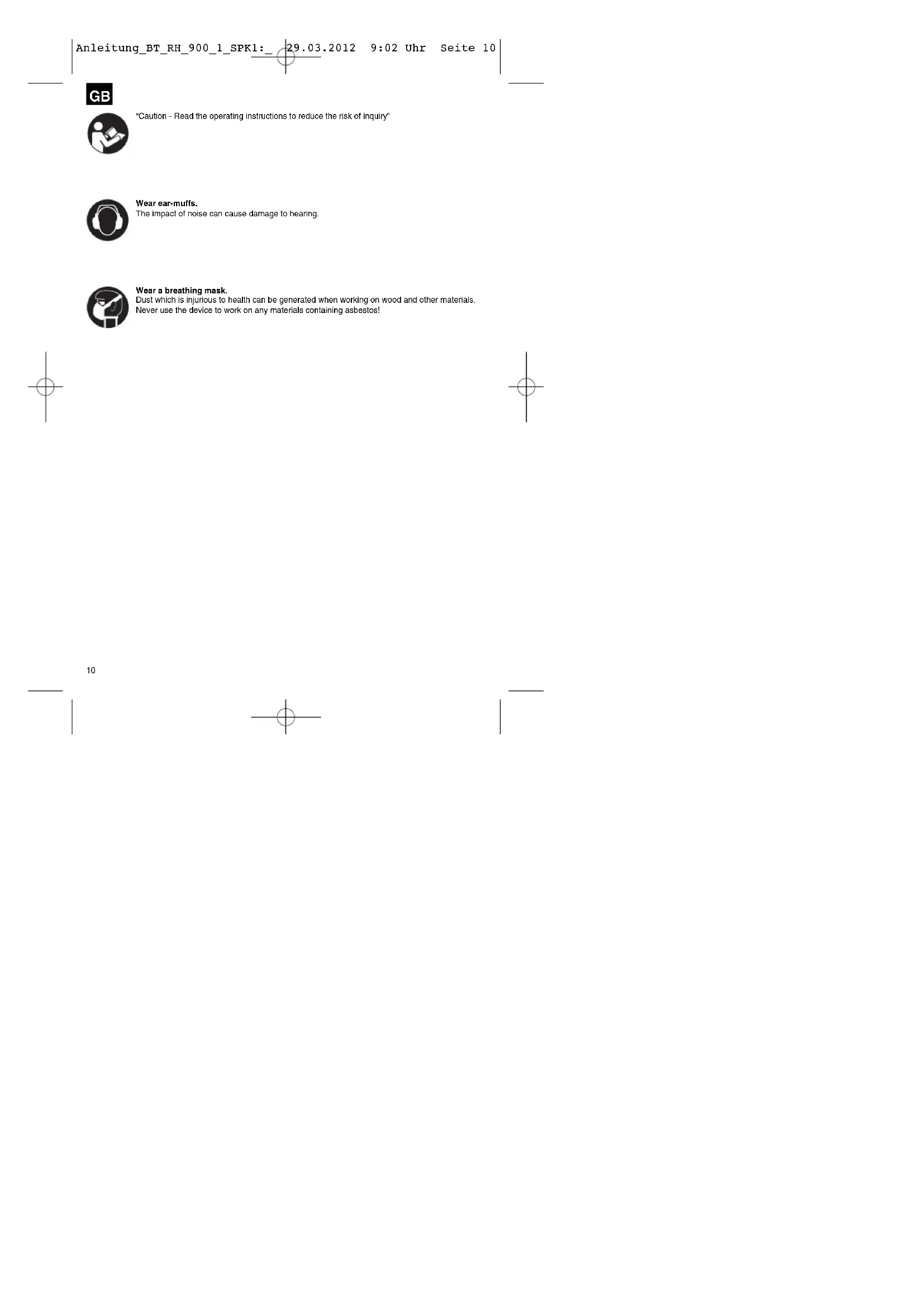 “Caution - Read the operating instructions to reduce the risk of inquiry” Wear ear-muffs. The impact of noise can cause damage to hearing. Wear a breathing mask. Dust which is injurious to health can be generated when working on wood and other materials. Never use the device to work on any materials containing asbestos! Anleitung_BT_RH_900_1_SPK1:_ 29.03.2012 9:02 Uhr Seite 10 Important! When using equipment, a few safety precautions must be observed to avoid injuries and damage. Please read the complete operating manual with due care. Keep this manual in a safe place, so that the information is available at all times. If you give the equipment to any other person, give them these operating instructions as well. We accept no liability for damage or accidents which arise due to non-observance of these instructions and the safety information.