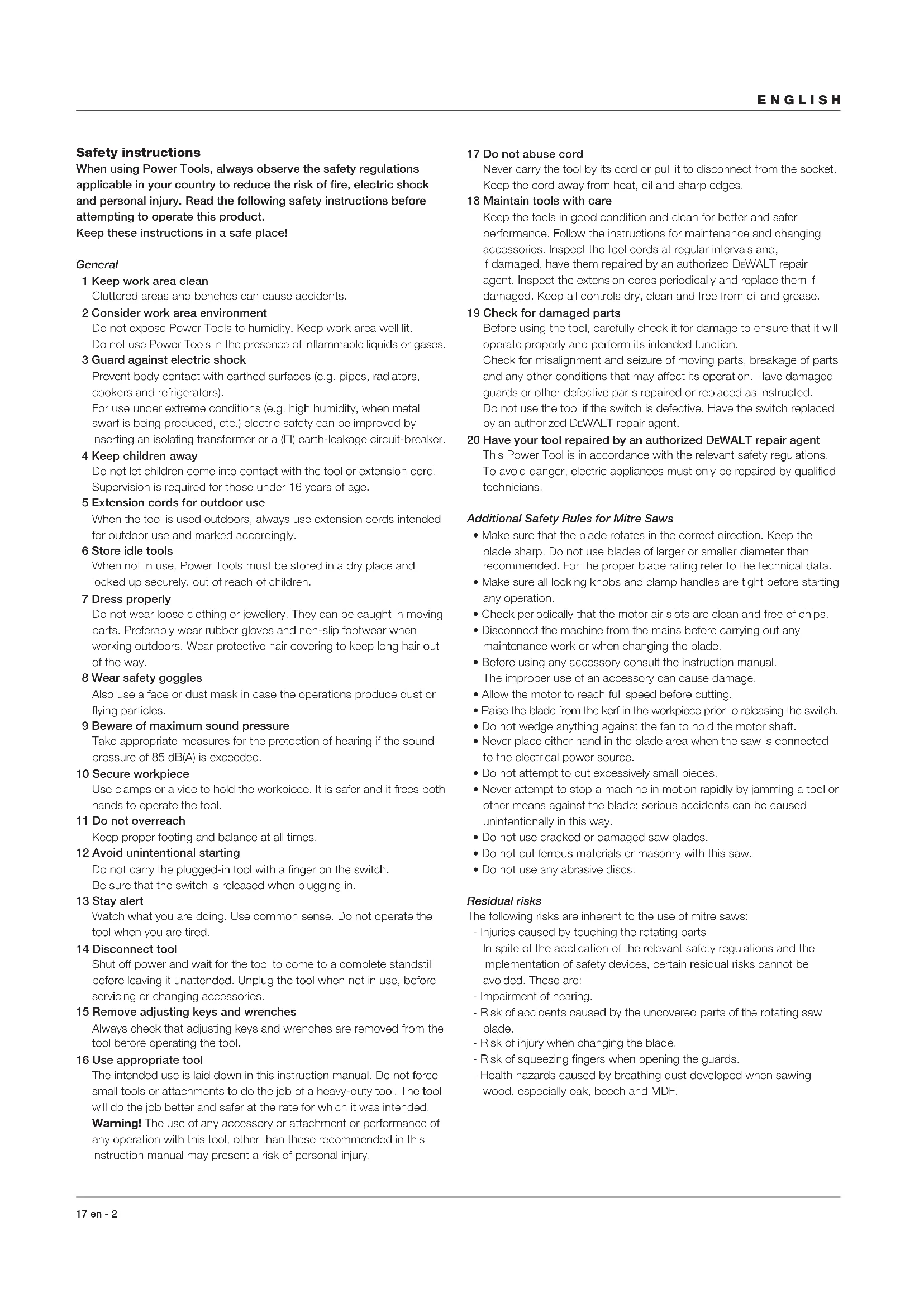 TÜV Rheinland Sicherheit und Umweltschutz GmbH Am Grauen Stein D-51105 Köln Germany Cert. No.BM 9410802 01 Director Engineering and Product Development Horst Großmann DEWALT, Richard-Klinger-Straße 40, D-65510, Idstein, Germany en - 1 16ENGLISH 17 en - 2 17 Do not abuse cord Never carry the tool by its cord or pull it to disconnect from the socket. Keep the cord away from heat, oil and sharp edges. 18 Maintain tools with care Keep the tools in good condition and clean for better and safer performance. Follow the instructions for maintenance and changing accessories. Inspect the tool cords at regular intervals and, if damaged, have them repaired by an authorized DEWALT repair agent. Inspect the extension cords periodically and replace them if damaged. Keep all controls dry, clean and free from oil and grease. 19 Check for damaged parts Before using the tool, carefully check it for damage to ensure that it will operate properly and perform its intended function. Check for misalignment and seizure of moving parts, breakage of parts and any other conditions that may affect its operation. Have damaged guards or other defective parts repaired or replaced as instructed. Do not use the tool if the switch is defective. Have the switch replaced by an authorized DEWALT repair agent. 20 Have your tool repaired by an authorized DEWALT repair agent This Power Tool is in accordance with the relevant safety regulations. To avoid danger, electric appliances must only be repaired by qualified technicians. Additional Safety Rules for Mitre Saws