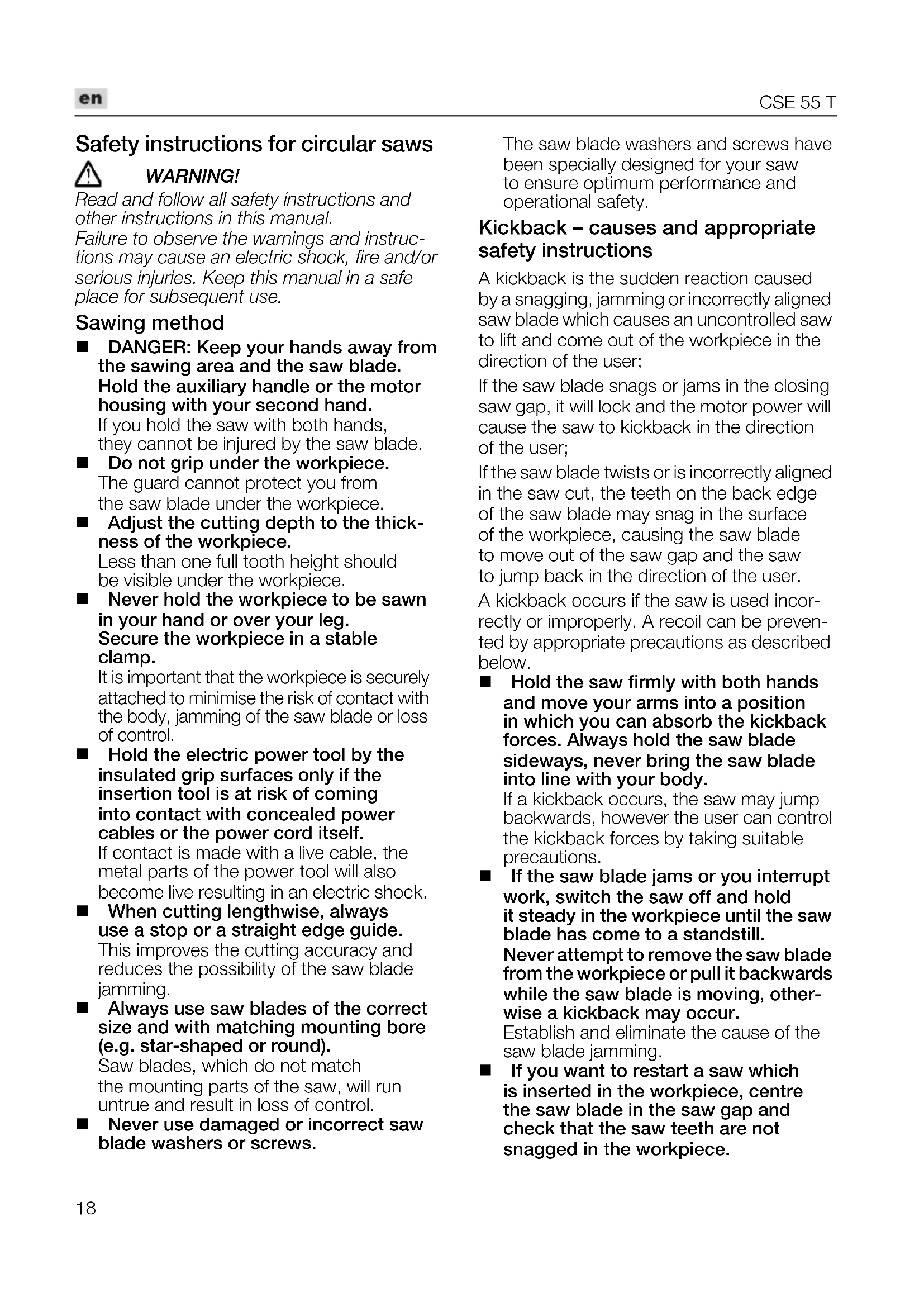 the sawing area and the saw blade. Hold the auxiliary handle or the motor housing with your second hand. If you hold the saw with both hands, they cannot be injured by the saw blade. Do not grip under the workpiece. The guard cannot protect you from the saw blade under the workpiece. Adjust the cutting depth to the thick- ness of the workpiece. Less than one full tooth height should be visible under the workpiece. Never hold the workpiece to be sawn in your hand or over your leg. Secure the workpiece in a stable clamp. It is important that the workpiece is securely attached to minimise the risk of contact with the body, jamming of the saw blade or loss of control. Hold the electric power tool by the insulated grip surfaces only if the insertion tool is at risk of coming into contact with concealed power cables or the power cord itself. If contact is made with a live cable, the metal parts of the power tool will also become live resulting in an electric shock. When cutting lengthwise, always use a stop or a straight edge guide. This improves the cutting accuracy and reduces the possibility of the saw blade jamming. Always use saw blades of the correct size and with matching mounting bore (e.g. star-shaped or round). Saw blades, which do not match the mounting parts of the saw, will run untrue and result in loss of control. Never use damaged or incorrect saw blade washers or screws. The saw blade washers and screws have been specially designed for your saw to ensure optimum performance and operational safety. Kickback – causes and appropriate safety instructions A kickback is the sudden reaction caused by a snagging, jamming or incorrectly aligned saw blade which causes an uncontrolled saw to lift and come out of the workpiece in the direction of the user; If the saw blade snags or jams in the closing saw gap, it will lock and the motor power will cause the saw to kickback in the direction of the user; If the saw blade twists or is incorrectly aligned in the saw cut, the teeth on the back edge of the saw blade may snag in the surface of the workpiece, causing the saw blade to move out of the saw gap and the saw to jump back in the direction of the user. A kickback occurs if the saw is used incor- rectly or improperly. A recoil can be preven- ted by appropriate precautions as described below. Hold the saw firmly with both hands and move your arms into a position in which you can absorb the kickback forces. Always hold the saw blade sideways, never bring the saw blade into line with your body. If a kickback occurs, the saw may jump backwards, however the user can control the kickback forces by taking suitable precautions. If the saw blade jams or you interrupt work, switch the saw off and hold it steady in the workpiece until the saw blade has come to a standstill. Never attempt to remove the saw blade from the workpiece or pull it backwards while the saw blade is moving, other- wise a kickback may occur. Establish and eliminate the cause of the saw blade jamming. If you want to restart a saw which is inserted in the workpiece, centre the saw blade in the saw gap and check that the saw teeth are not snagged in the workpiece.CSE 55 T