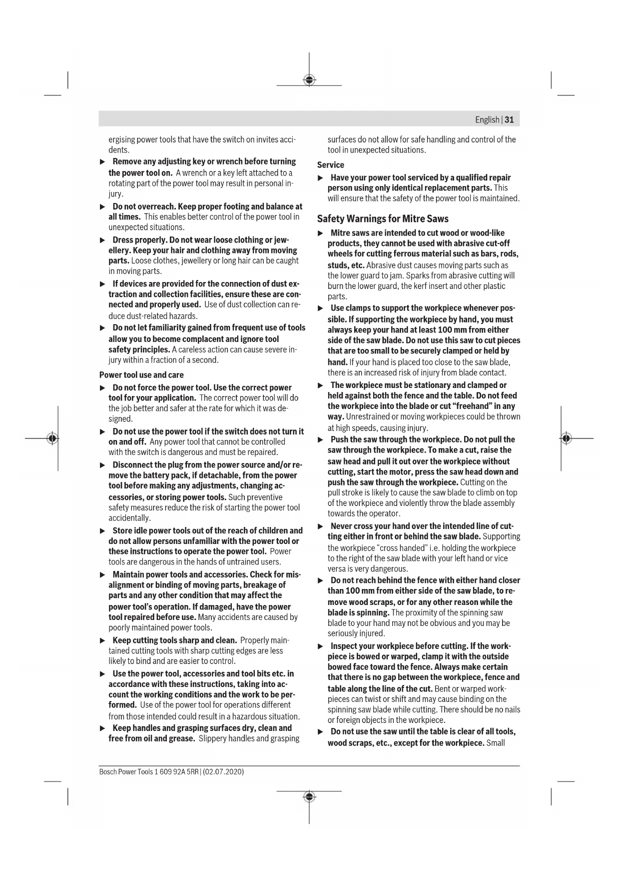 45°; 31.6°; 22.5°; 15° 15°; 22.5°; 31.6°; 45°; 60° – Loosen the locking knob (11) if it is tightened. – Pull the lever (12) and rotate the saw table (38) left or right to the required detent. – Release the lever again. The lever must be felt to engage in the detent. – Retighten the locking knob (11). Setting Any Mitre Angle (see figure I) The mitre angle can be set between 52° (left side) and 60° (right side). – Loosen the locking knob (11) if it is tightened. – Pull the lever (12) and at the same time press the locking clamp (10) until this clicks into the slot provided for it. This means the saw table can now move freely. – Turn the saw table (38) left or right by the locking knob until the angle indicator (58) shows the required mitre angle. – Retighten the locking knob (11). – To loosen the lever (12) again (for setting standard mitre angles), pull the lever upwards. The locking clamp (10) springs back into its original posi- tion and the lever (12) can click back into the detents (15). Adjusting vertical mitre angles The bevel angle can be set between 47° (left side) and 47° (right side). For quick and precise setting of frequently used bevel angles, stops have been provided for the angles 0°, 22.5°, 45° and 47°. Setting the left-hand bevel angle range (45° to 0°) – Pull the left-hand adjustable fence(5) all the way out. 1 609 92A 5RR | (02.07.2020) Bosch Power ToolsEnglish | 39 – Loosen the clamping handle(13). – Use the handle(1) to swivel the glide arm(28) to the left until the angle indicator(33) shows the required bevel angle. – Hold the glide arm(28) in this position and retighten the clamping handle(13). The clamping force of the clamping handle must hold the glide arm securely in place at any bevel angle. Setting the Right-hand Bevel Angle Range (0° to 45°) (see figureJ) – Pull the right-hand adjustable fence(5) all the way out. – Loosen the clamping handle(13). – Use the handle(1) to tilt the glide arm(28) slightly to the left from the 0° position and turn the rotary knob(39) un- til the required bevel angle range is shown. – Use the handle(1) to swivel the glide arm(28) to the right until the angle indicator(21) shows the required bevel angle. – Hold the glide arm(28) in this position and retighten the clamping handle(13). The clamping force of the clamping handle must hold the glide arm securely in place at any bevel angle. Setting the Standard 0° bevel angle To enable the standard 0° bevel angle to be reset easily, the rotary knob (39) engages in the left- hand bevel angle range. – Swivel the glide arm (28) from the right to the 0° position. Setting the entire bevel angle range (–47° to +47°) – Pull both adjustable fences(5) all the way out. – Loosen the clamping handle(13). – Use the handle(1) to tilt the glide arm(28) slightly to the left from the 0° position and turn the rotary knob(39) un- til the required bevel angle range is shown. – Use the handle(1) to swivel the glide arm(28) to the left or right until the angle indicator(33) or(21) shows the required bevel angle. – Hold the glide arm(28) in this position and retighten the clamping handle(13). The clamping force of the clamping handle must hold the glide arm securely in place at any bevel angle. Setting the Standard 22.5° Bevel Angle (see figure K) Pull the adjustment knob (34) all the way out and turn it 90°. Then use the handle (1) to swivel the glide arm (28) until you hear the glide arm engage. Start-up u Products that are only sold in AUS and NZ: Use a resid- ual current device (RCD) with a nominal residual current of 30 mA or less. Switching on (see figureL) – To switch on the power tool, first slide the lock-off but- ton(2) to the middle and then press and hold the on/off switch(59). Note: For safety reasons, the on/off switch (59) cannot be locked; it must remain pressed during the entire operation. Switching off – To switch off, release the on/off switch (59). Starting current limitation The electronic starting current limitation feature restricts the power of the power tool when it is switched on and enables operation using a 16 A fuse. Note: If the power tool runs at full speed immediately after being switched on, this means that the starting current limit- ation and restarting protection mechanisms have failed. The power tool should be sent immediately to an after-sales ser- vice. Practical advice General sawing instructions Marking the cutting line (see figure M) Two laser beams indicate the cutting width of the saw blade. This allows for exact positioning of the workpiece for sawing, without having to open the retracting blade guard. – Switch on the laser beams with the switch (60). – Position your mark on the workpiece between the two laser lines. Note: Before sawing, check if the cutting width is still indic- ated correctly Adjusting the Laser. Vibrations during intens- ive use, for example, can cause the laser beams to become misaligned. Position of the Operator (see figure N) u Do not stand in line with the saw blade in front of the power tool. Always stand to the side of the saw blade. This protects your body against possible kickback. – Keep hands, fingers and arms away from the rotating saw blade. – Do not reach one arm across the other when in front of the glide arm (28). Replacing the Insert Plates (see figure O) The red insert plates (9) can become worn after prolonged use of the power tool. Replace defective insert plates. – Bring the power tool into the work position. – Loosen the screws (61) using the hex key (4 mm) (17) and remove the old insert plates. – Insert the new right-hand insert plate. Bosch Power Tools 1 609 92A 5RR | (02.07.2020)40 | English – Screw the insert plate as far as possible to the right with the screws (61) so that the saw blade does not come into contact with the insert plate over the entire length of the possible slide motion. – Repeat the work steps in the sam
