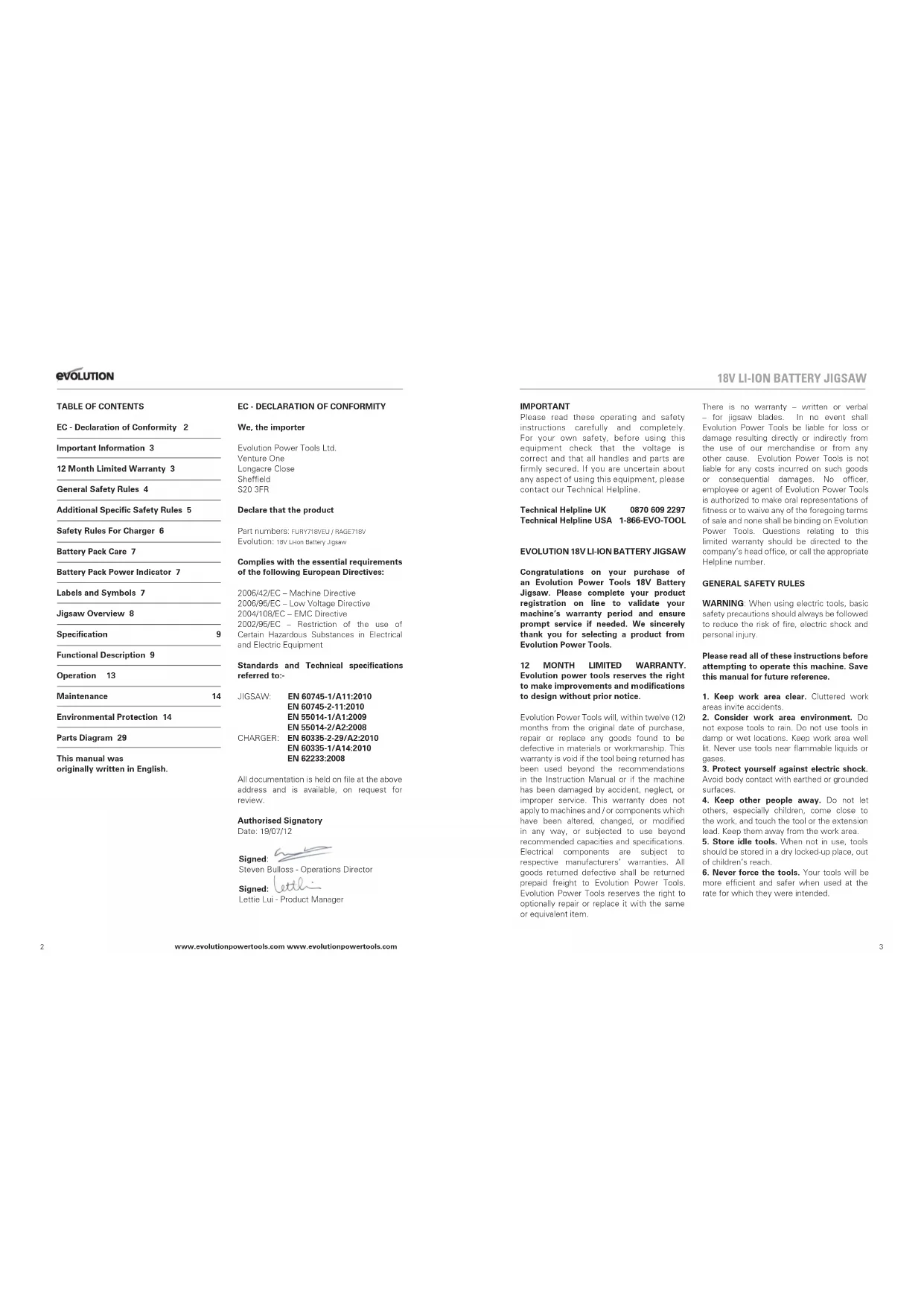 We, the importer Evolution Power Tools Ltd. Venture One Longacre Close Sheffield S20 3FR Declare that the product Part numbers: FURY718VEU / RAGE718V Evolution: 18V Li-ion Battery Jigsaw Complies with the essential requirements of the following European Directives: 2006/42/EC – Machine Directive 2006/95/EC – Low Voltage Directive 2004/108/EC – EMC Directive 2002/95/EC – Restriction of the use of Certain Hazardous Substances in Electrical and Electric Equipment Standards and Technical specifications referred to:-