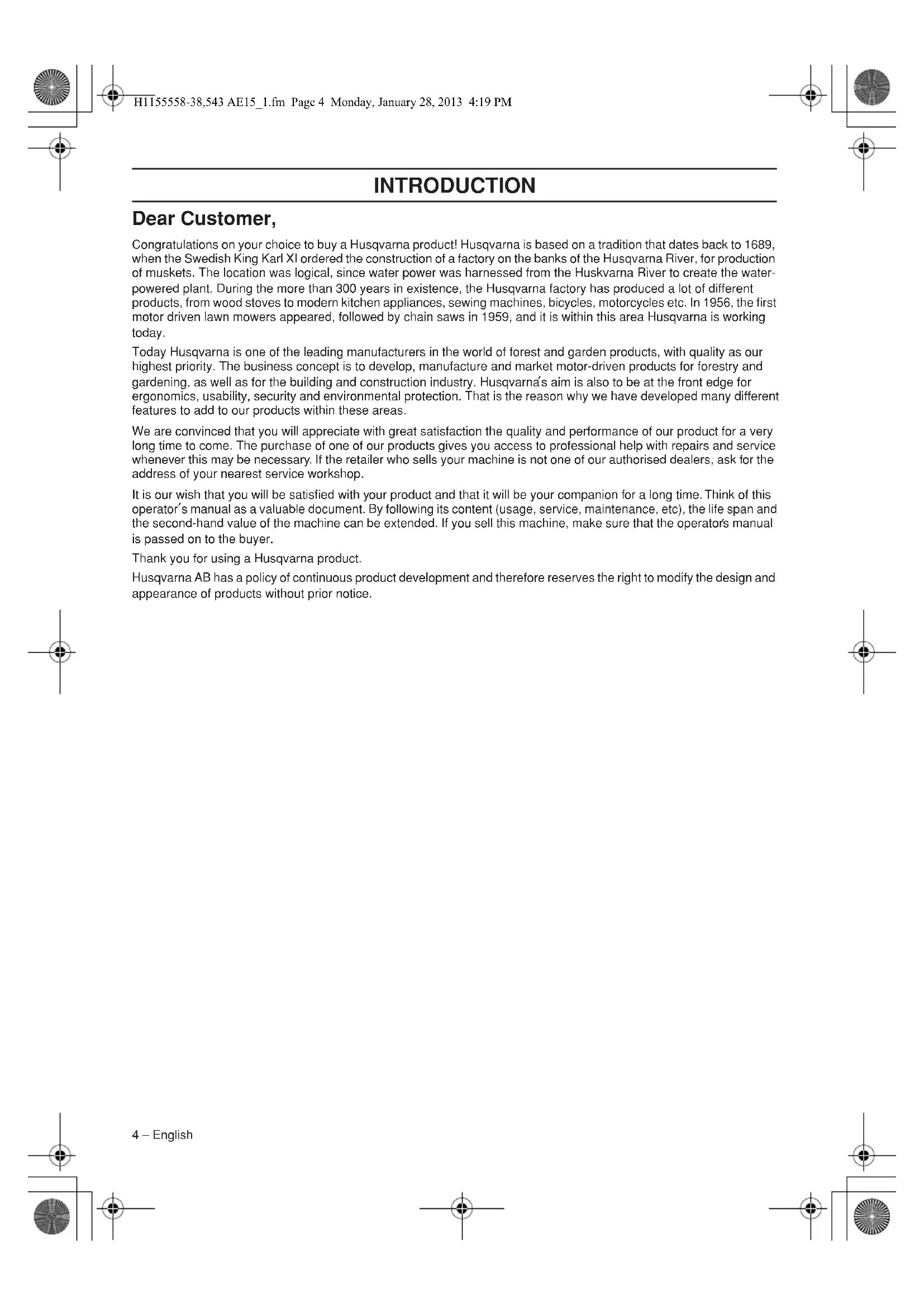 WARNING! An earth auger is a dangerous tool if used carelessly or incorrectly and can cause serious, even fatal injuries. It is extremely important that you read and understand the contents of this Operator’s Manual. H1155558-38,543 AE15_1.fm Page 3 Monday, January 28, 2013 4:19 PM4 – English INTRODUCTION Dear Customer, Congratulations on your choice to buy a Husqvarna product! Husqvarna is based on a tradition that dates back to 1689, when the Swedish King Karl XI ordered the construction of a factory on the banks of the Husqvarna River, for production of muskets. The location was logical, since water power was harnessed from the Huskvarna River to create the water- powered plant. During the more than 300 years in existence, the Husqvarna factory has produced a lot of different products, from wood stoves to modern kitchen appliances, sewing machines, bicycles, motorcycles etc. In 1956, the first motor driven lawn mowers appeared, followed by chain saws in 1959, and it is within this area Husqvarna is working today. Today Husqvarna is one of the leading manufacturers in the world of forest and garden products, with quality as our highest priority. The business concept is to develop, manufacture and market motor-driven products for forestry and gardening, as well as for the building and construction industry. Husqvarna