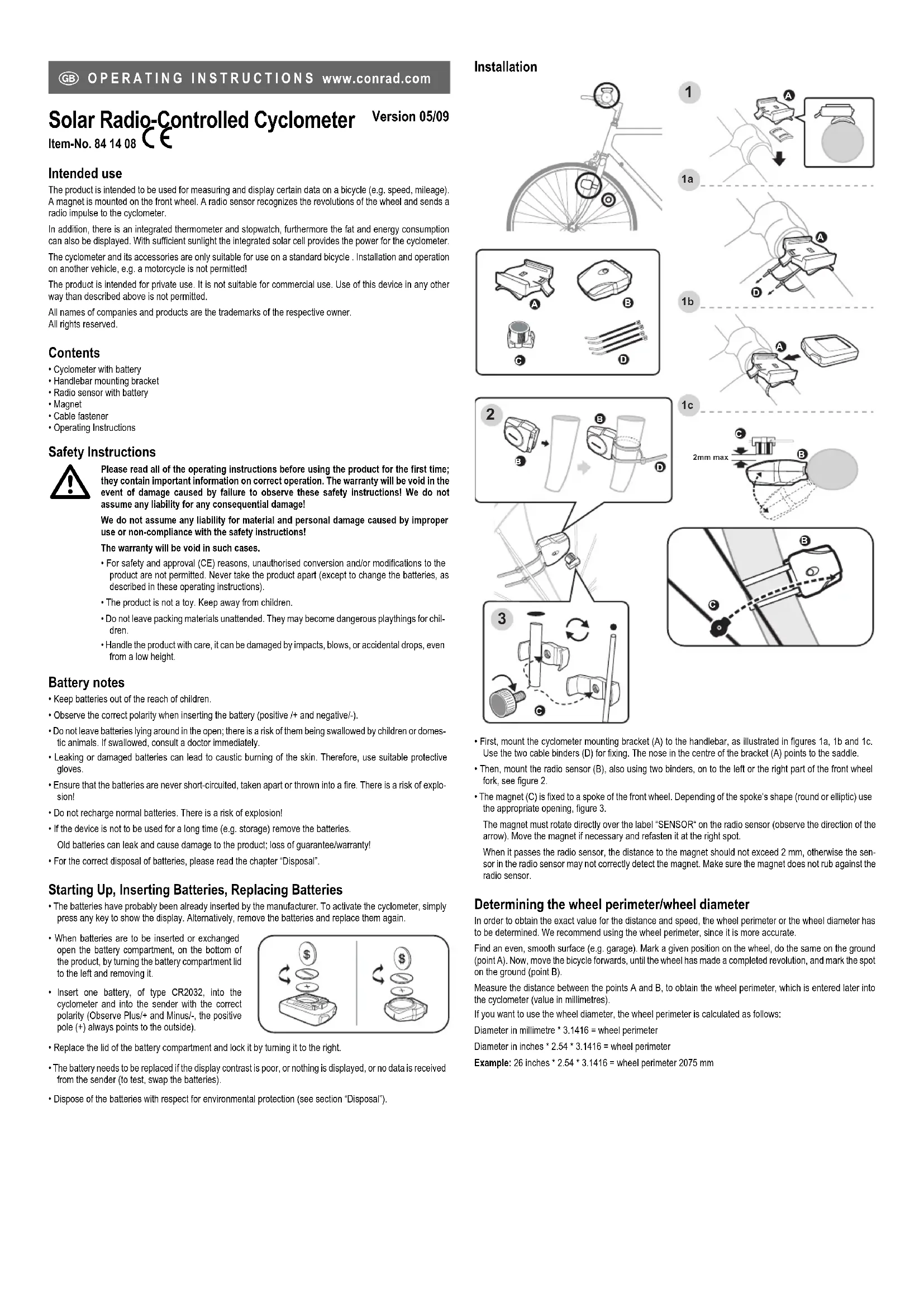 - First, mount the cyclometer mounting bracket (A) to the handlebar, as illustrated in figures 1a, 1b and 1c.Use the two cable binders (D) for fixing. The nose in the centre of the bracket (A) points to the saddle.• Then, mount the radio sensor (B), also using two binders, on to the left or the right part of the front wheelfork, see figure 2.• The magnet (C) is fixed to a spoke of the front wheel. Depending of the spoke’s shape (round or elliptic) usethe appropriate opening, figure 3.The magnet must rotate directly over the label “SENSOR“ on the radio sensor (observe the direction of thearrow). Move the magnet if necessary and refasten it at the right spot. When it passes the radio sensor, the distance to the magnet should not exceed 2 mm, otherwise the sen-sor in the radio sensor may not correctly detect the magnet. Make sure the magnet does not rub against theradio sensor. Determining the wheel perimeter/wheel diameter In order to obtain the exact value for the distance and speed, the wheel perimeter or the wheel diameter hasto be determined. We recommend using the wheel perimeter, since it is more accurate.Find an even, smooth surface (e.g. garage). Mark a given position on the wheel, do the same on the ground(point A). Now, move the bicycle forwards, until the wheel has made a completed revolution, and mark the spoton the ground (point B). Measure the distance between the points A and B, to obtain the wheel perimeter, which is entered later intothe cyclometer (value in millimetres).If you want to use the wheel diameter, the wheel perimeter is calculated as follows: Diameter in millimetre * 3.1416 = wheel perimeterDiameter in inches * 2.54 * 3.1416 = wheel perimeterExample: 26 inches * 2.54 * 3.1416 = wheel perimeter 2075 mm