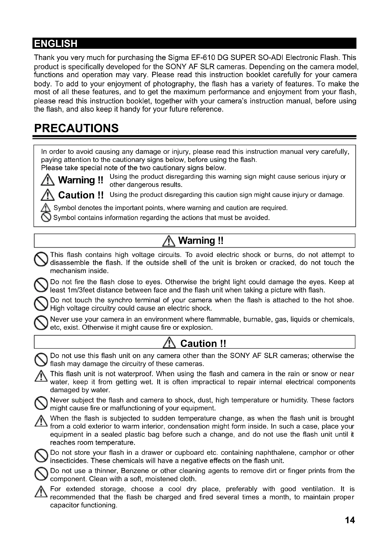 other dangerous results. Using the product disregarding this caution sign might cause injury or damage. Warning !! This flash contains high voltage circuits. To avoid electric shock or burns, do not attempt to disassemble the flash. If the outside shell of the unit is broken or cracked, do not touch themechanism inside. Do not fire the flash close to eyes. Otherwise the bright light could damage the eyes. Keep atleast 1m/3feet distance between face and the flash unit when taking a picture with flash.