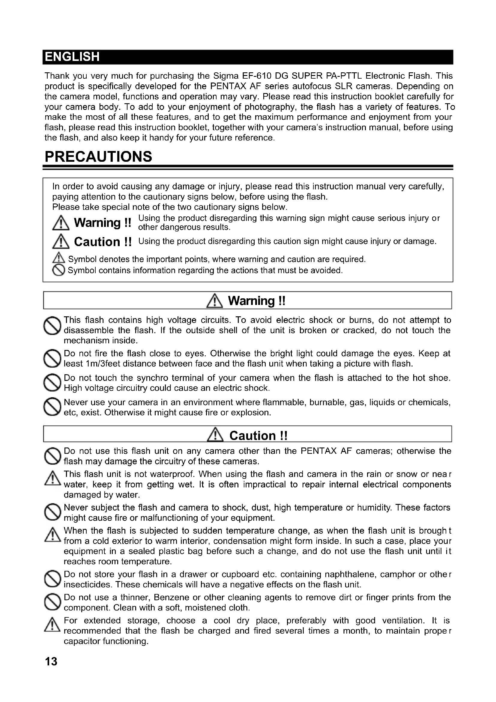989-7451 大阪営業所 〒541-0059 大阪市中央区博労町 1-7-2 堺筋トラストビル 8F 06(6271)1548 工 場 〒969-3395 福島県耶麻郡磐梯町大字大谷字日知坂 6594 0242(73)2771(代) インターネットホームページアドレス http://www.sigma-photo.co.jp13 ENGLISH Thank you very much for purchasing the Sigma EF-610 DG SUPER PA-PTTL Electronic Flash. This product is specifically developed for the PENTAX AF series autofocus SLR cameras. Depending on the camera model, functions and operation may vary. Please read this instruction booklet carefully for your camera body. To add to your enjoyment of photography, the flash has a variety of features. To make the most of all these features, and to get the maximum performance and enjoyment from your flash, please read this instruction booklet, together with your camera’s instruction manual, before using the flash, and also keep it handy for your future reference. PRECAUTIONS In order to avoid causing any damage or injury, please read this instruction manual very carefully, paying attention to the cautionary signs below, before using the flash. Please take special note of the two cautionary signs below. Warning !! Caution !! Symbol denotes the important points, where warning and caution are required. Symbol contains information regarding the actions that must be avoided. Using the product disregarding this warning sign might cause serious injury o