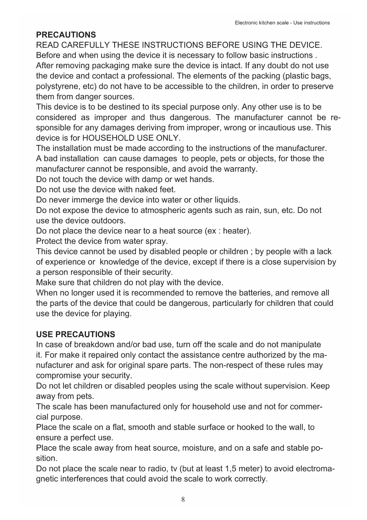 In case of breakdown and/or bad use, turn off the scale and do not manipulate it. For make it repaired only contact the assistance centre authorized by the manufacturer and ask for original spare parts. The non-respect of these rules may compromise your security.
