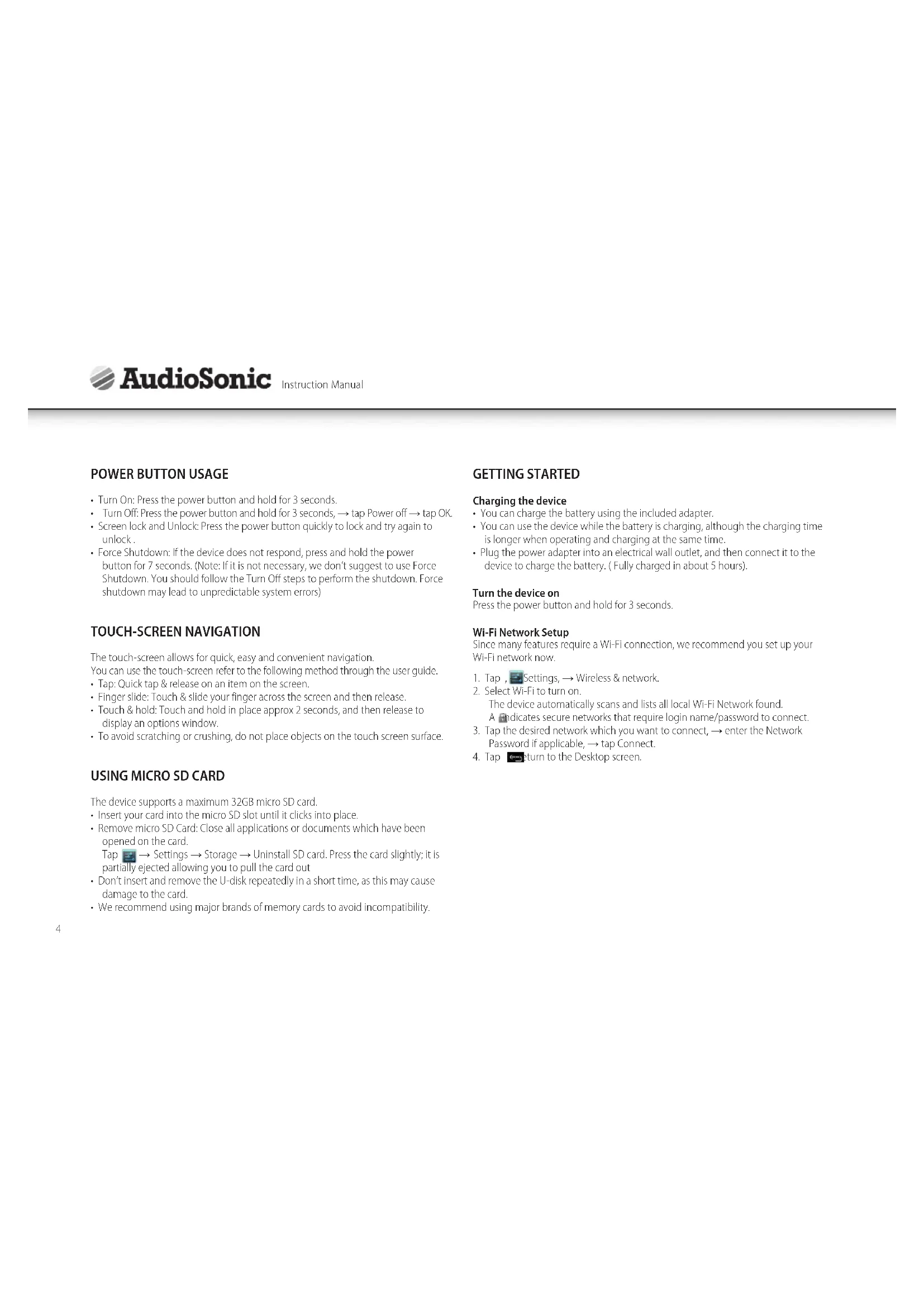 Android Q: What Android OS version is on my device? A: 4.1.1 Basic Device Functionary Q: Do I have to charge the battery before use? A: You should charge the battery for at least 4 hours, but you can use the device while it’s charging. Use the include power adapter or an USB cable, that’s connected to a power supply, to charge E-mail Q: Can I use any of my personal e-mail addresses to send/receive e-mail? A: The device supports POP3, SMTP and IMAP accounts. Some free e-mail accounts are not supported on mobile devices. Check with your e-mail provider to see if you account is supported. Media Cards Q: Which media cards are compatible with my device? A: Micro SD cards up to size of 32GB. Music Q: How do I add music files to my device? A: Copy the music files from your computer onto a SD card or USB storage device, and then use the File Browser application to copy the files onto the device. Photos Q: How do I add photo files to my device? A: Copy the photo files from your computer onto a SD card or USB storage device, and then use the File Browser application to copy the files onto the device. Wi-Fi Q: Do I need a Wi-Fi adapter to connect to the Internet? A: No. The Wi-Fi adapter is built-in to the device. BATTERY MANAGEMENT The battery is not fully charged out of the box, so it is recommended that you charge the battery for at least 4 hours before you start to use the device for the first time. The rechargeable battery is designed and manufactured to be recharged frequently. As with all batteries, the capacity of the battery reduces each time it is charged/ depleted. However, you can try to prolong the battery’s lifetime by following the suggestions below: