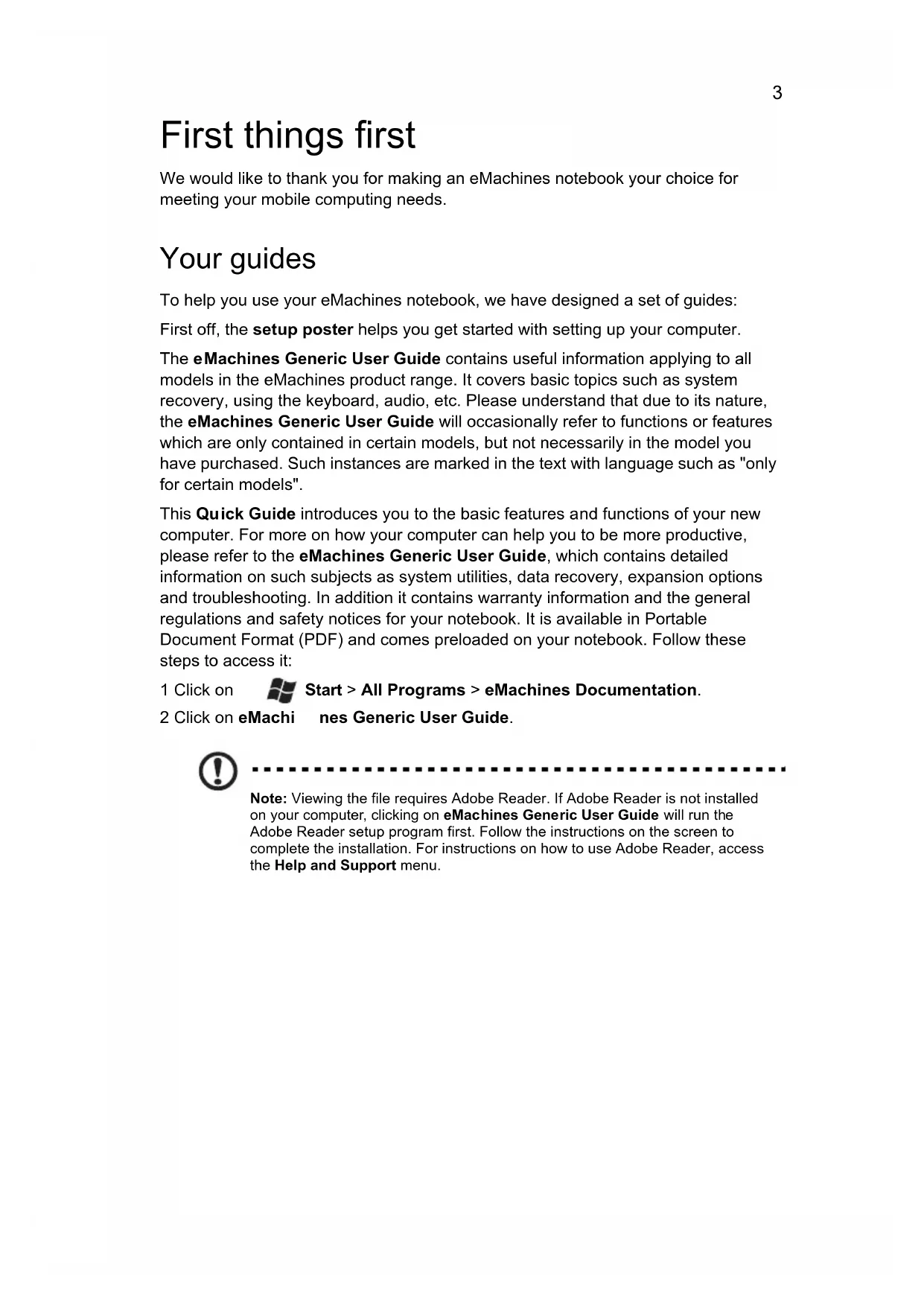 Bahasa Indonesia ä·Â ContentseMachines Notebook Series Quick GuideModel number: __________________________________ Serial number: ___________________________________ Date of purchase: ________________________________ Place of purchase: ________________________________ © 2010 All Rights Reserved. eMachines Notebook Series Quick Guide Original Issue: 07/2010 eMachines Notebook Series3 First things first We would like to thank you for making an eMachines notebook your choice for meeting your mobile computing needs. Your guides To help you use your eMachines notebook, we have designed a set of guides: First off, the set up poster helps you get started with setting up your computer. The e Machines Generic User Guide contains useful information applying to all models in the eMachines product range. It covers basic topics such as system recovery, using the keyboard, audio, etc. Please understand that due to its nature, the eMachines Generic User Guide will occasionally refer to functions or features which are only contained in certain models, but not necessarily in the model you have purchased. Such instances are marked in the text with language such as "only for certain models". This Qu ick Guide introduces you to the basic features and functions of your new computer. For more on how your computer can help you to be more productive, please refer to the eMachines Generic User Guide, which contains detailed information on such subjects as system utilities, data recovery, expansion options and troubleshooting. In addition it contains warranty information and the general regulations and safety notices for your notebook. It is available in Portable Document Format (PDF) and comes preloaded on your notebook. Follow these steps to access it: 1 Click on Start > All Programs > eMachines Documentation. 2 Click on eMachi nes Generic User Guide. Note: Viewing the file requires Adobe Reader. If Adobe Reader is not installed on your computer, clicking on eMachines Generic User Guide will run the Adobe Reader setup program first. Follow the instructions on the screen to complete the installation. For instructions on how to use Adobe Reader, access the Help and Support menu.4 English Your eMachines notebook tour After setting up your computer as illustrated in the setup poster, let us show you around your new eMachines notebook. Top view # Icon Item Description 1 Integrated webcam Web camera for video communication (only for certain models).