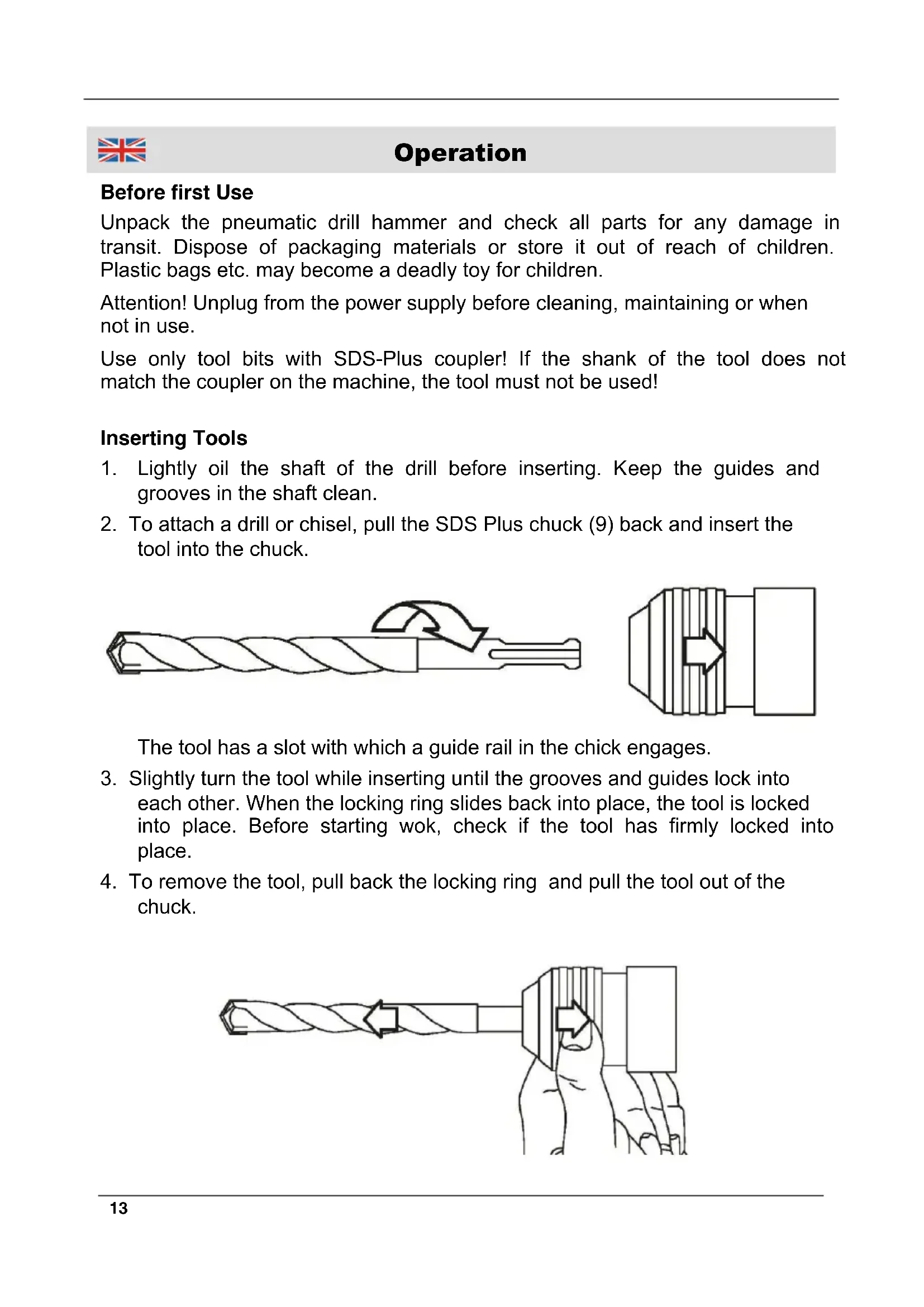 Operation Before first Use Unpack the pneumatic drill hammer and check all parts for any damage in transit. Dispose of packaging materials or store it out of reach of children. Plastic bags etc. may become a deadly toy for children. Attention! Unplug from the power supply before cleaning, maintaining or when not in use. Use only tool bits with SDS-Plus coupler! If the shank of the tool does not match the coupler on the machine, the tool must not be used! Inserting Tools