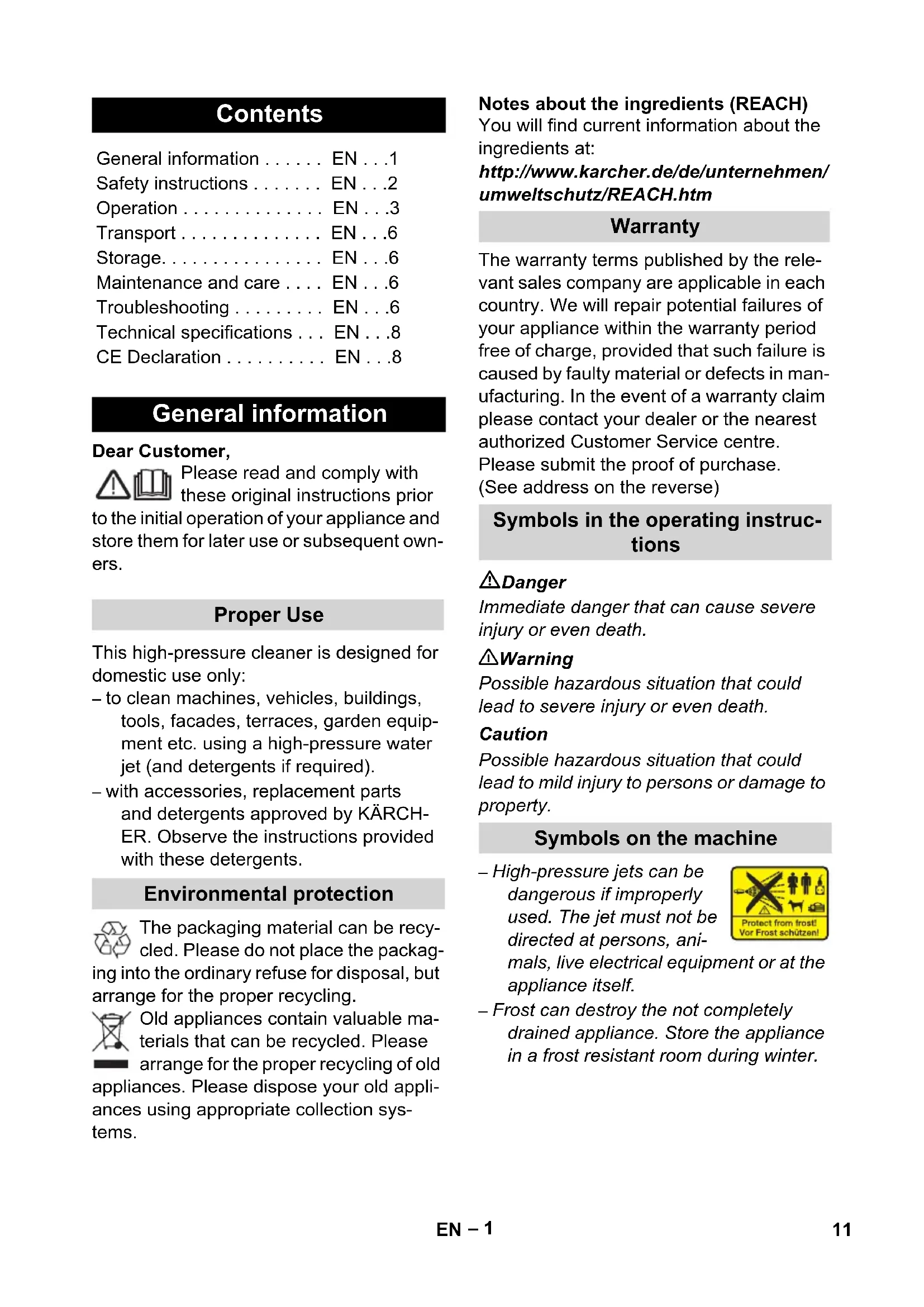 • EN General information Proper Use Environmental protection Warranty Symbols in the operating instruc- tions Symbols on the machine 11EN– 2 Danger Never touch the mains plug and the socket with wet hands. The appliance must not be used if the power cord or important parts of the ap- pliance, e.g. high-pressure hoses, trig- ger gun or safety devices are damaged. Check the power cord and mains plug for damage before every use. If the power cord is damaged, please arrange for it to be replaced immediately by an authorised repair agent or a skilled electrician Check the high-pressure hose for dam- age before every use. Please arrange for the immediate replacement of a damaged high-pressure hose. The appliance may not be used in areas where a risk of explosion is present. If the appliance is used in hazardous ar- eas (e.g. filling stations) the corre- sponding safety provisions must be observed. High-pressure jets can be dangerous if improperly used. The jet must not be di- rected at persons, animals, live electri- cal equipment or at the appliance itself. The high-pressure jet must not be di- rected at other persons or directed by the user at him/herself to clean clothing or footwear. Never use the appliance to clean ob- jects containing hazardous substances (e.g. asbestos). Vehicle tyres or tyre valves are suscep- tible to damage from the high-pressure jet and may burst. The first indication of this is a discolouration of the tyre. Dam- aged vehicle tyres/tyre valves are high- ly dangerous. Ensure that a distance of at least 30 cm is observed when clean- ing with the jet! Risk of explosion! Do not spray flammable liquids. Never draw in fluids containing solvents or undiluted acids and solvents! This in- cludes petrol, paint thinner and heating oil. The spray mist thus generated is highly inflammable, explosive and poi- sonous. Do not use acetone, undiluted acids and solvents as they are damag- ing to the materials from which the ap- pliance is made. 몇 Warning The mains plug and the coupling of an extension cable must be watertight and must never lay in the water. Unsuitable extension cables can be hazardous. Only use extension cables outdoors which have been approved for this purpose and labelled with a suffi- cient cable cross-section: 1 - 10 m: 1.5 p. 8